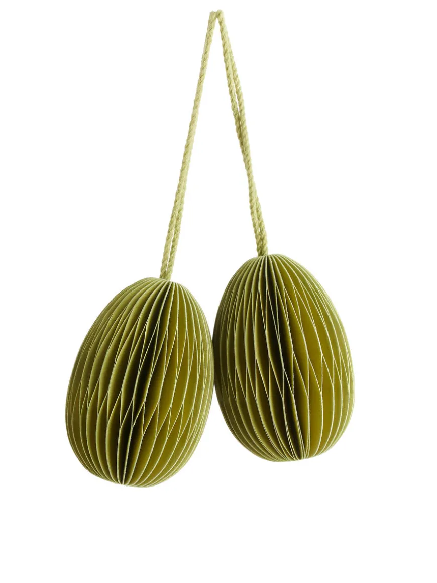 Ornaments made from sturdy paper and a cotton ribbon for easy hanging. Height of egg 4.8 cm. Width 3.4 cm. Ribbon 6 cm. Pack of two.