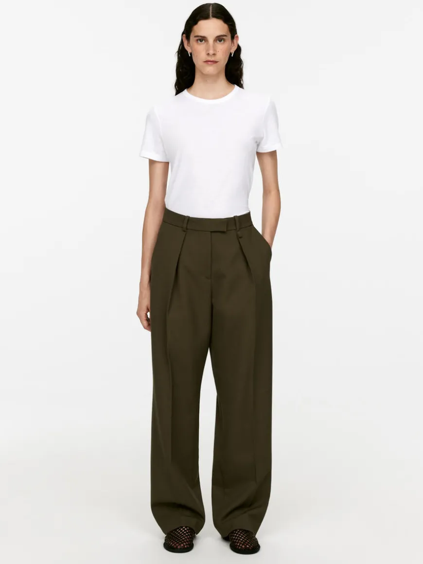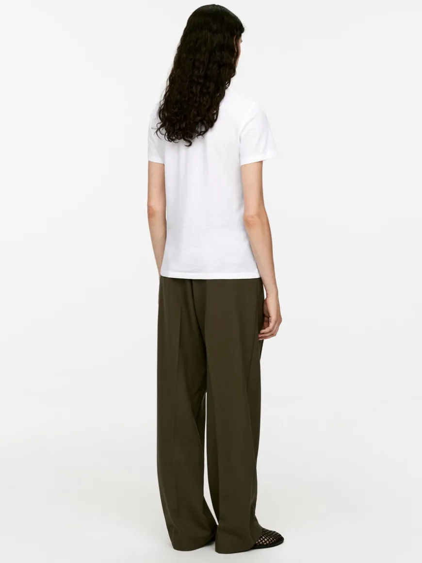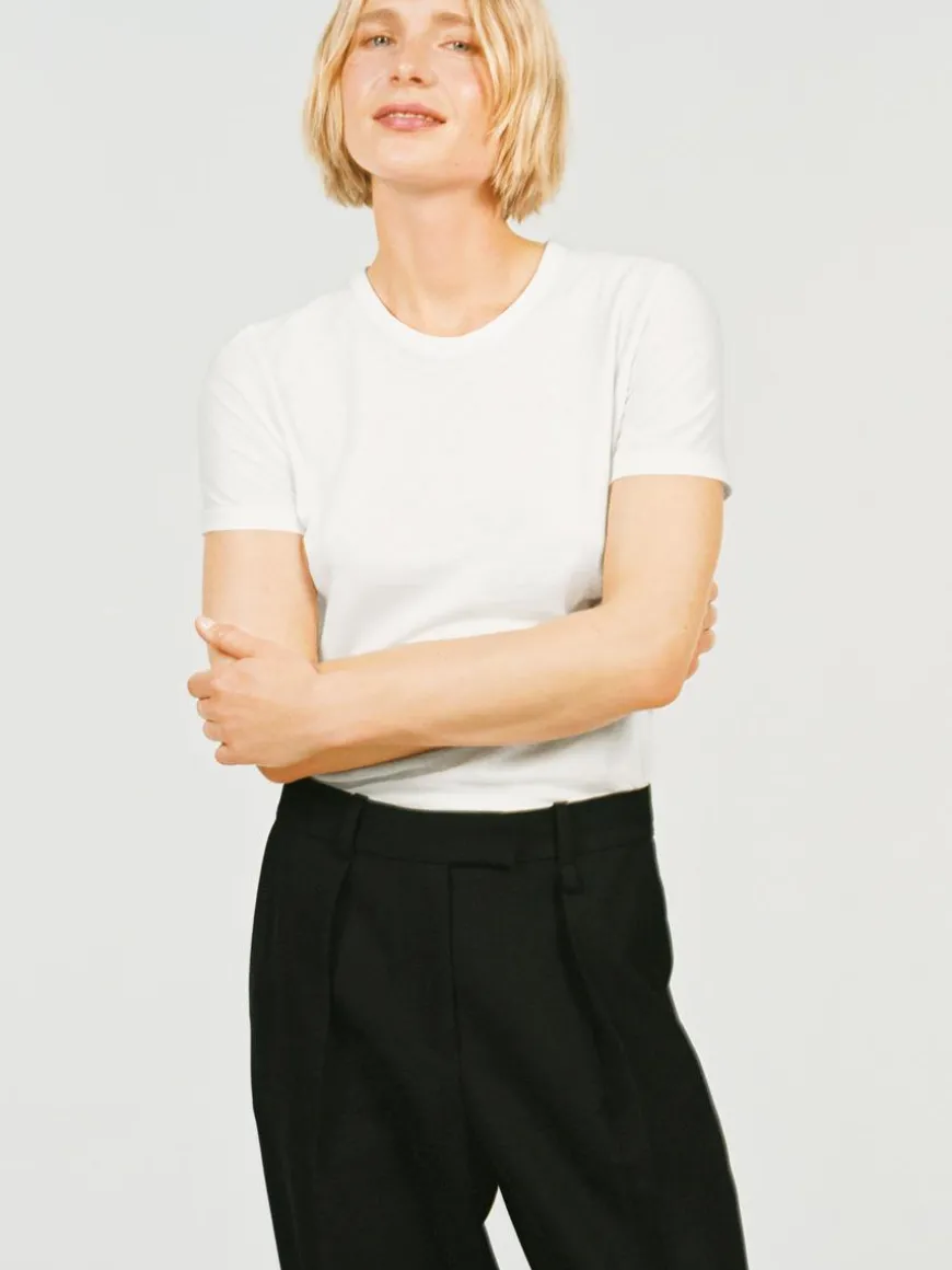 Fitted t-shirt crafted from an ice crêpe knitted cotton quality that combines fluidity with a unique crisp hand feel. Detailed with bamboo stitches at end of sleeves and bottom hem and a wide binding at neck.
