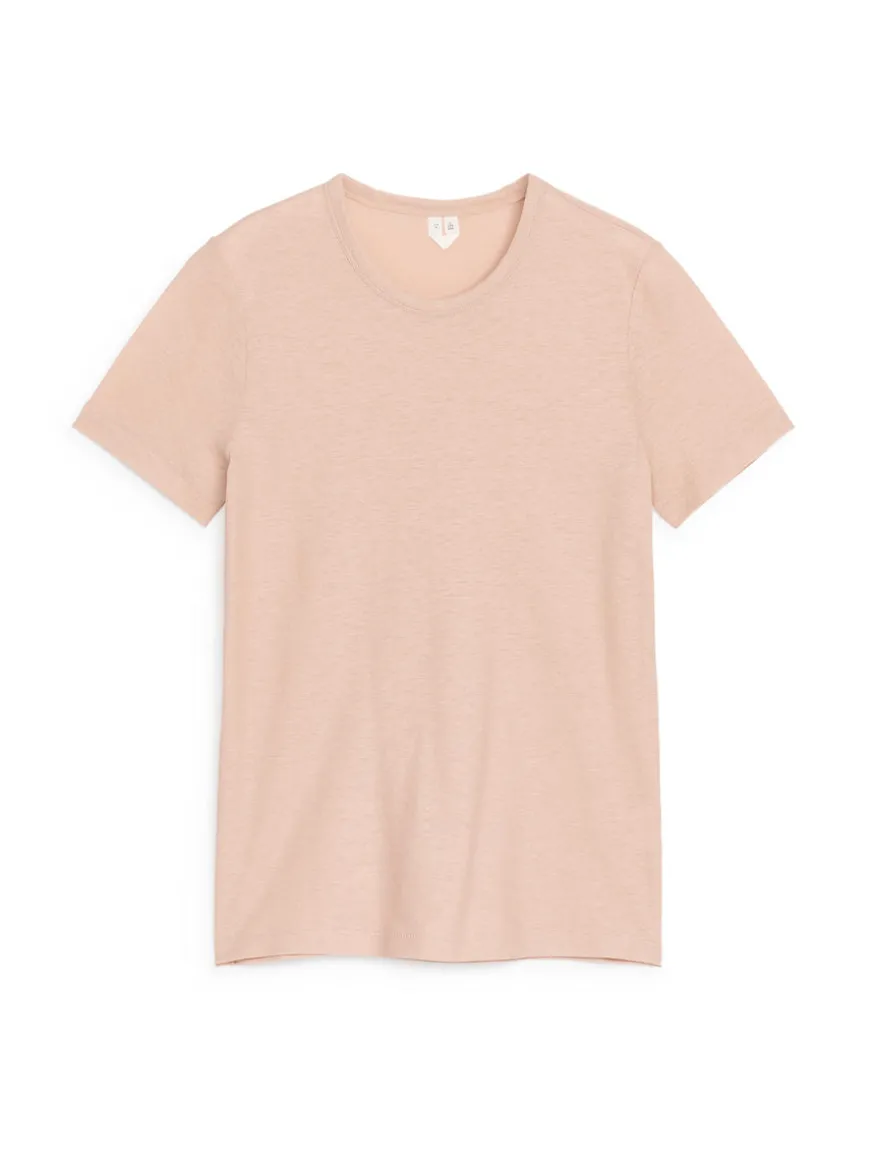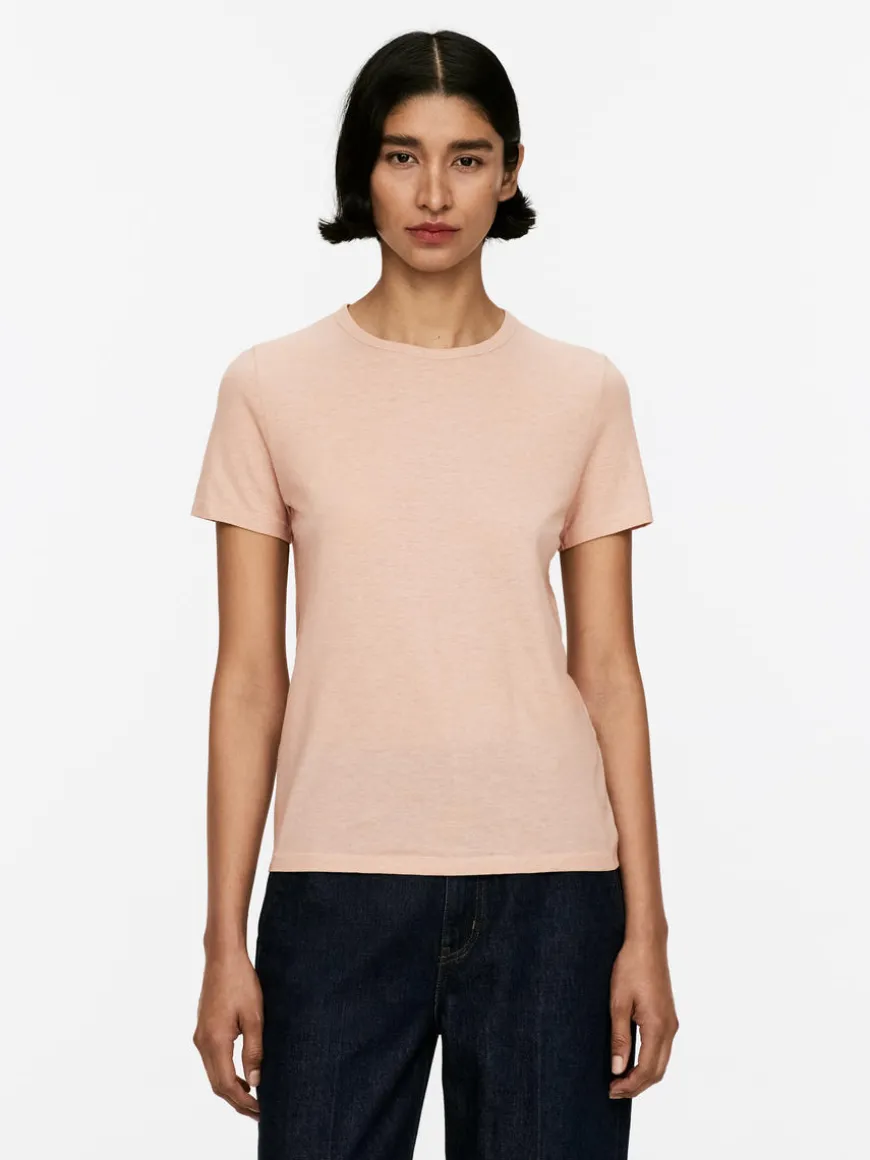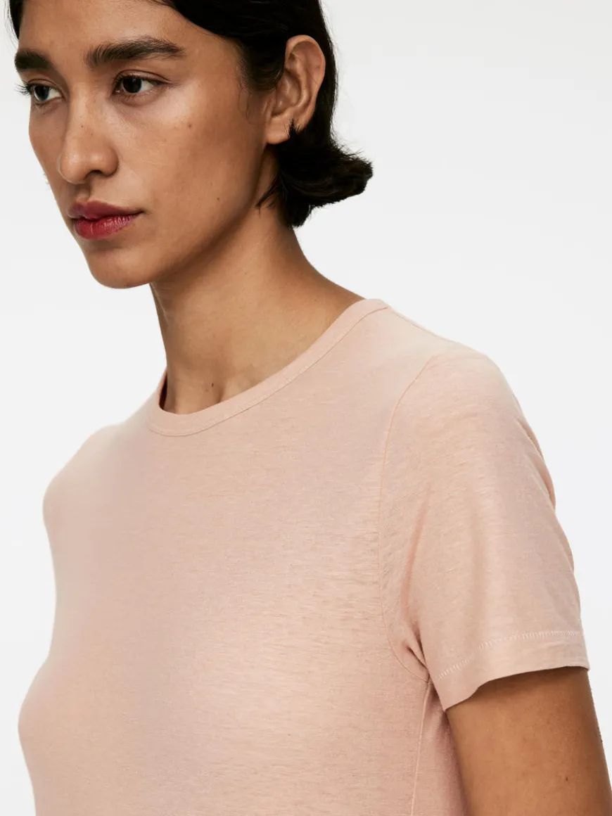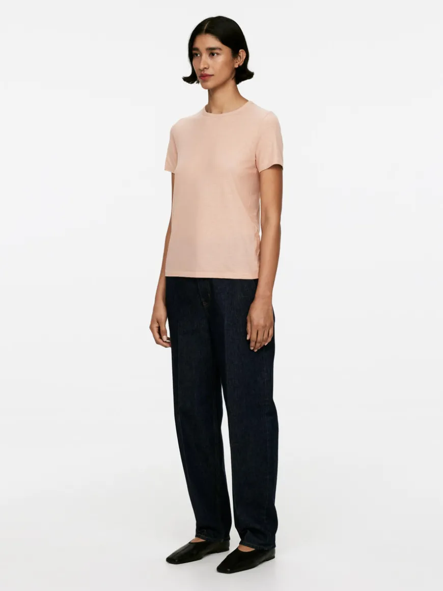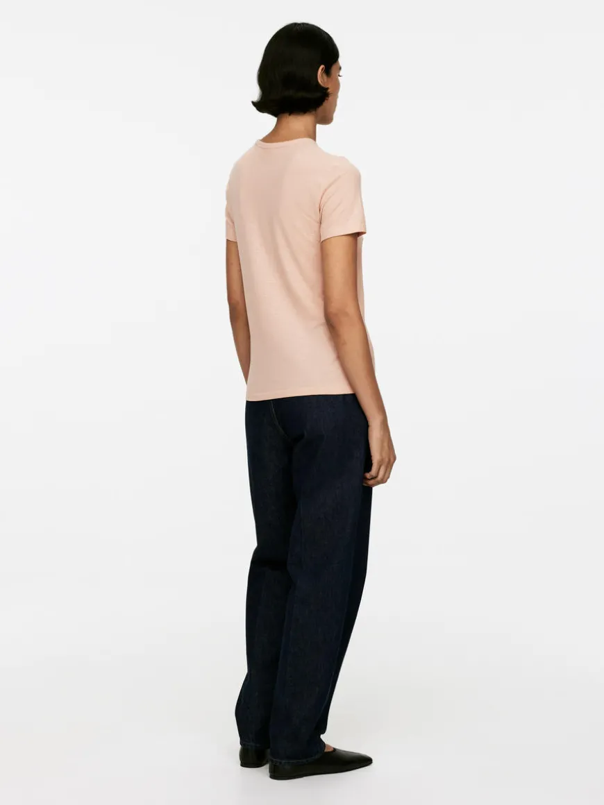 Fitted t-shirt crafted from an ice crêpe knitted cotton quality that combines fluidity with a unique crisp hand feel. Detailed with bamboo stitches at end of sleeves and bottom hem and a wide binding at neck.