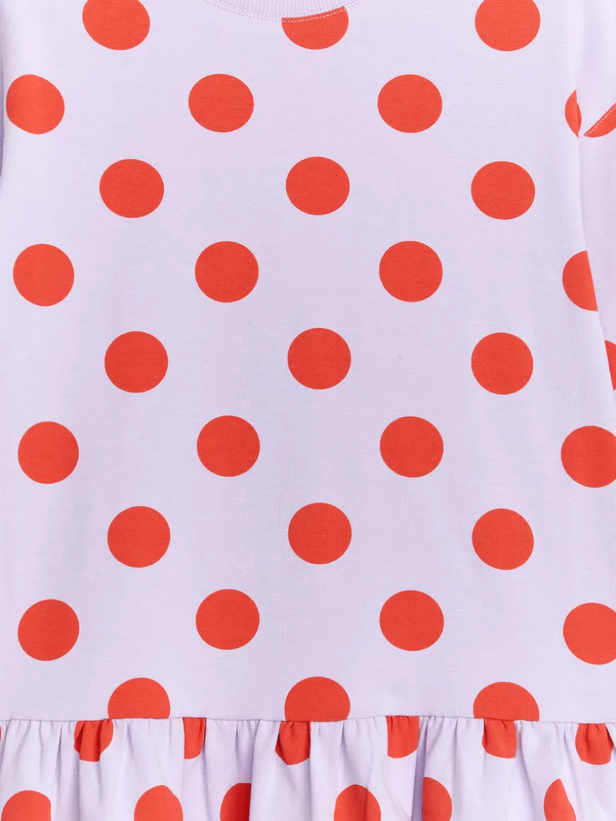 Long-sleeve frill dress crafted from a soft interlock jersey. Cut for a relaxed fit with dropped shoulders. Ribbed trimming at neckline.