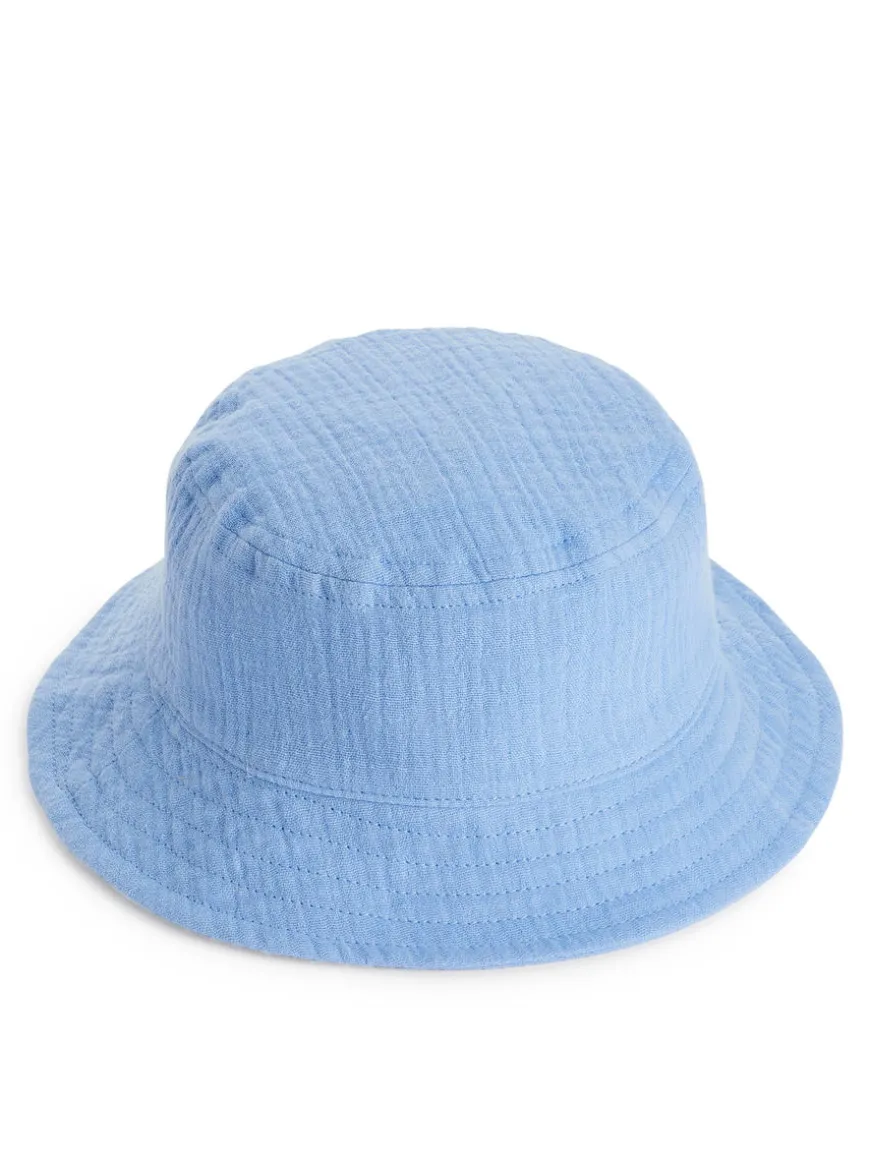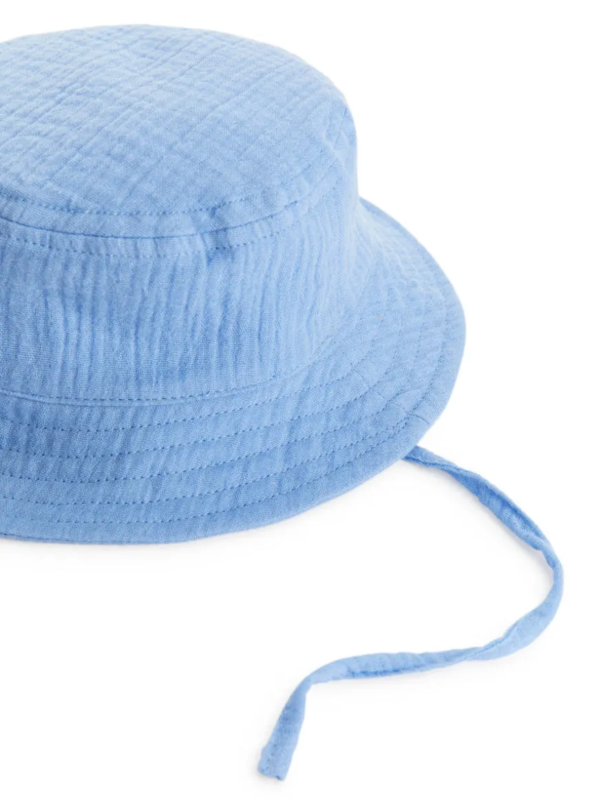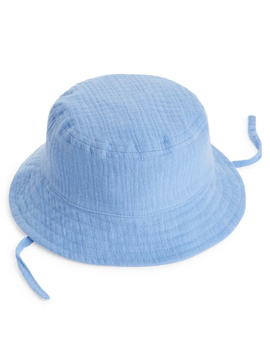 Bucket hat made from a soft cotton muslin weave. String to tie under neck.