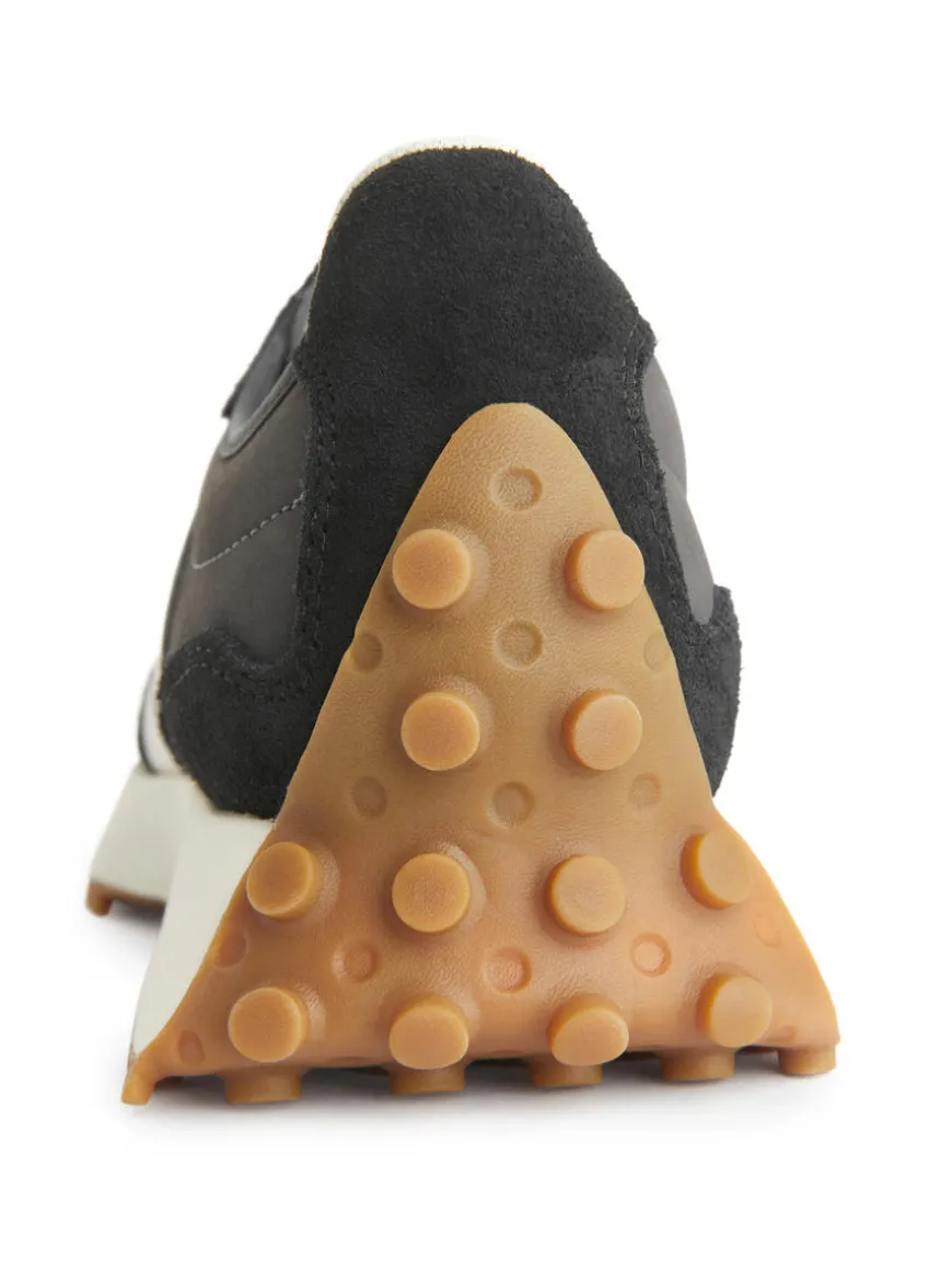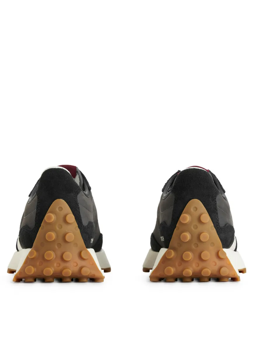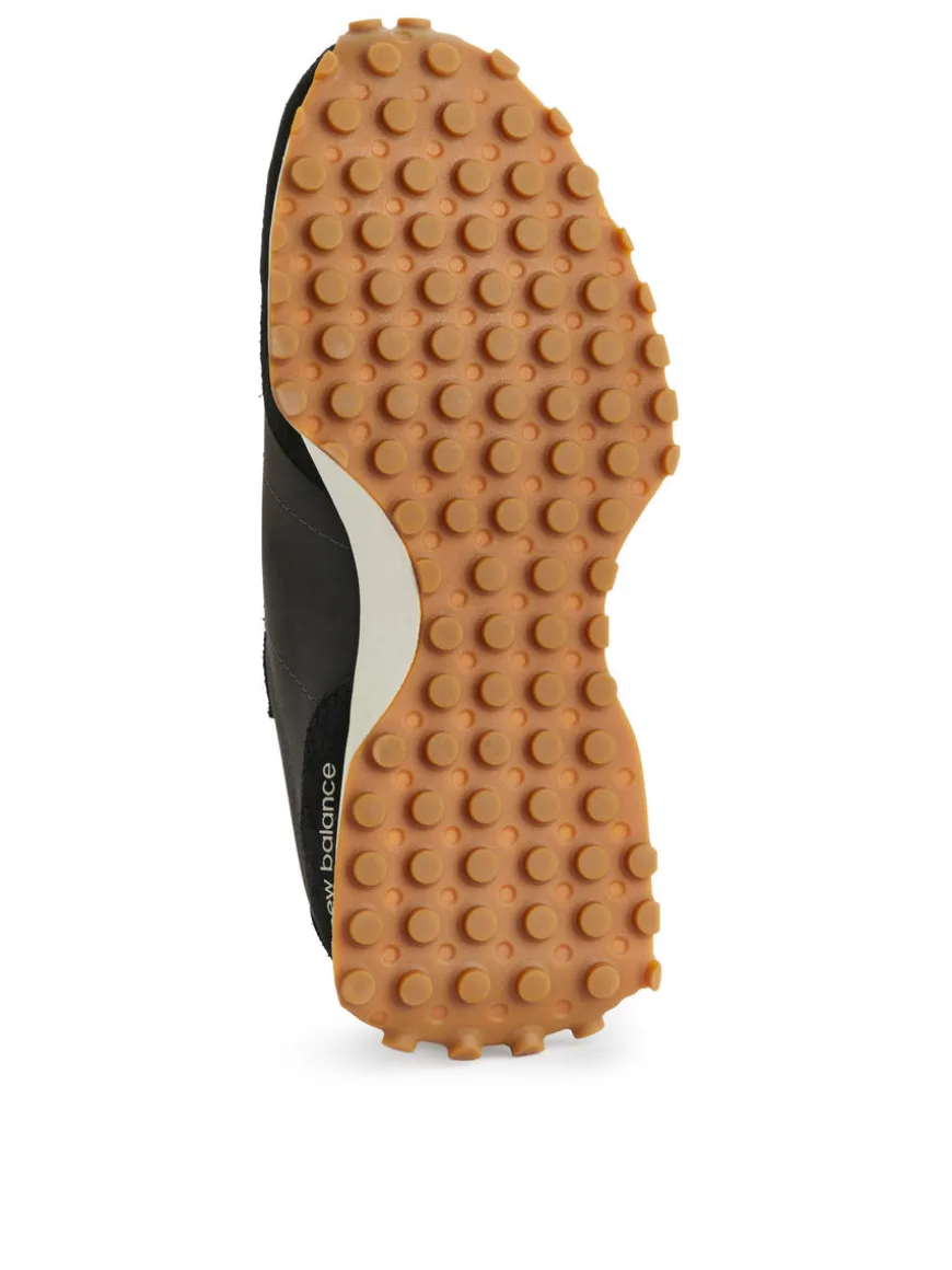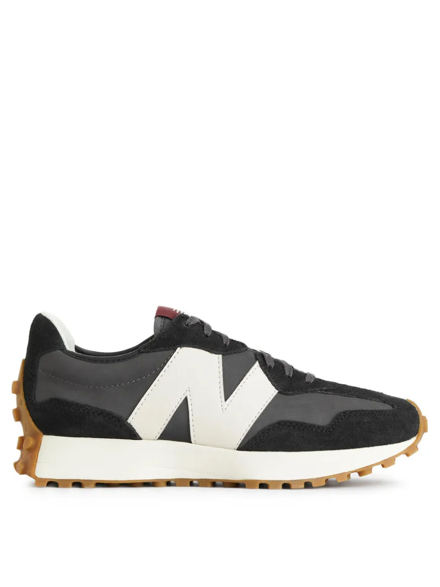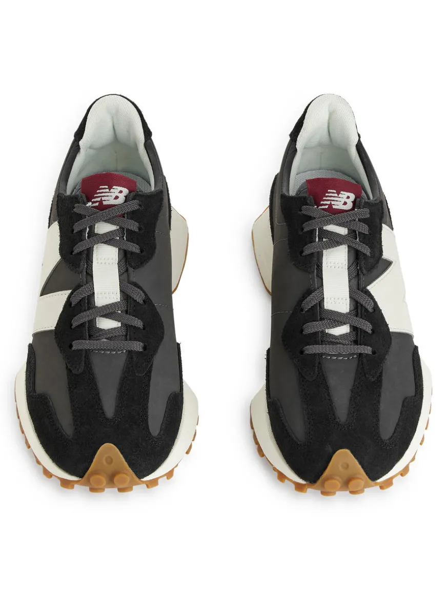 New Balance 327 featuring a leather upper with stitched detailing in suede and an oversized logo. Rubber sole.