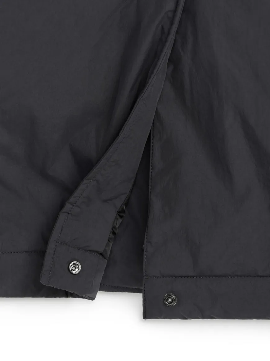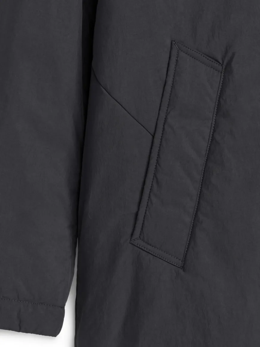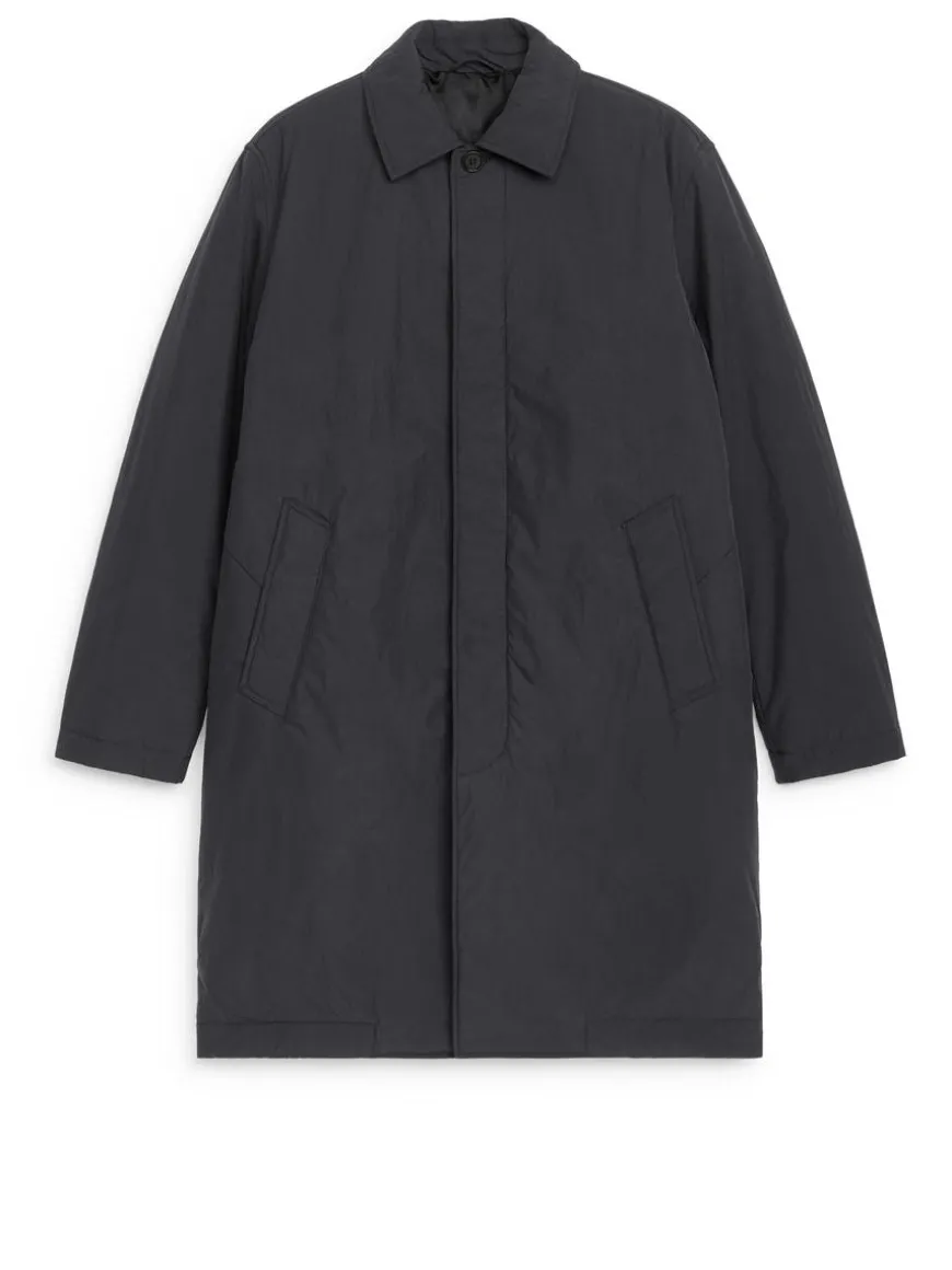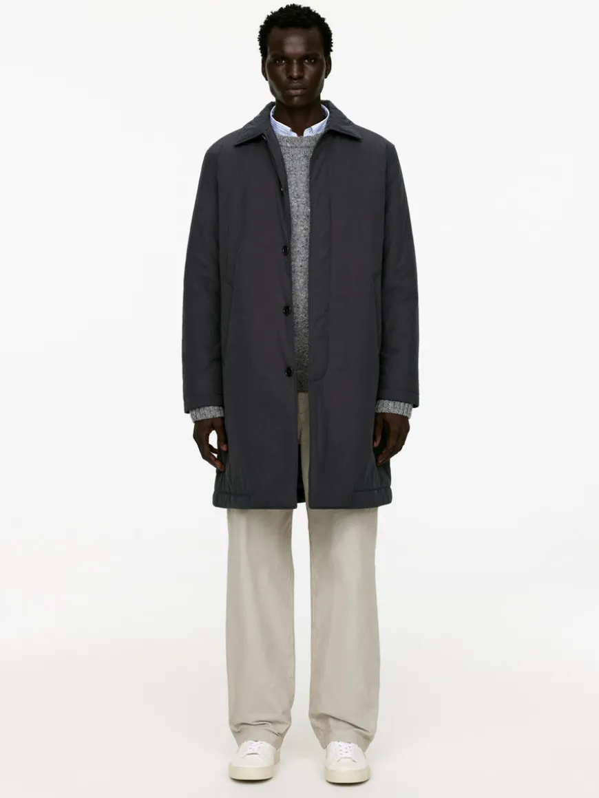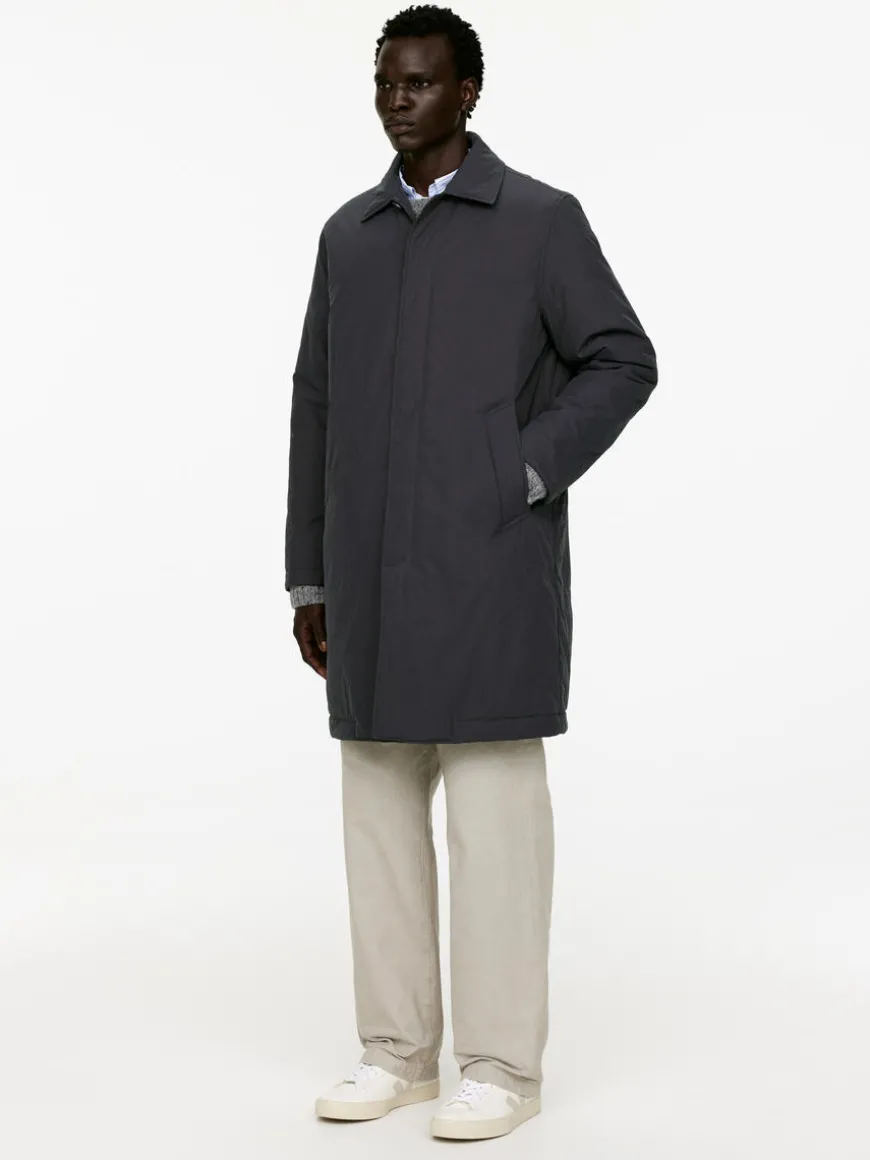 Padded coat with hidden button closure and slanted pockets. A knee-length style featuring a slit with hidden snap button at centre back and lining in both body and sleeves. Regular fit.