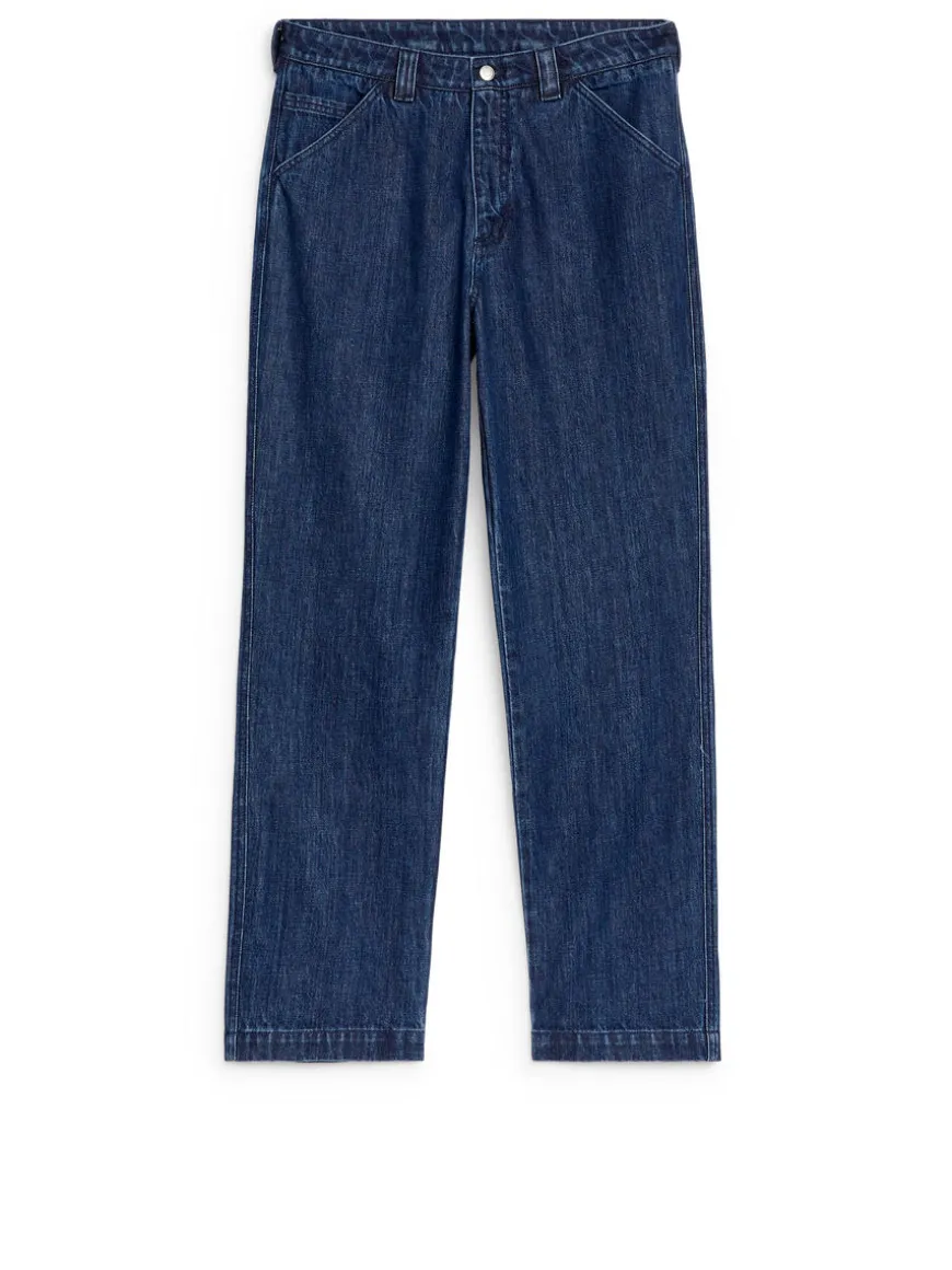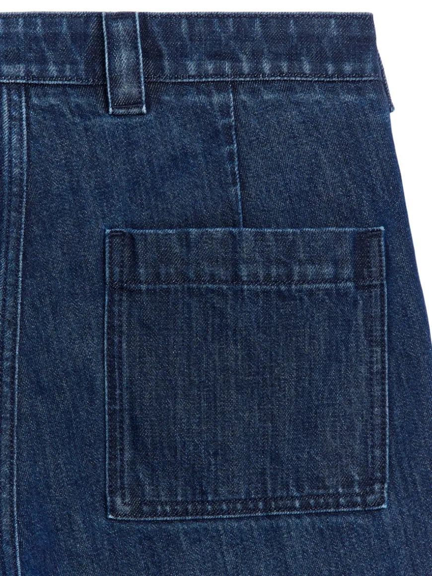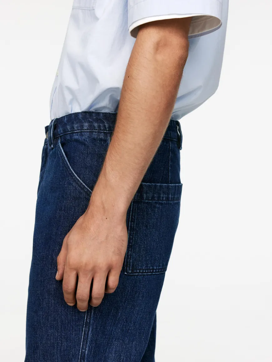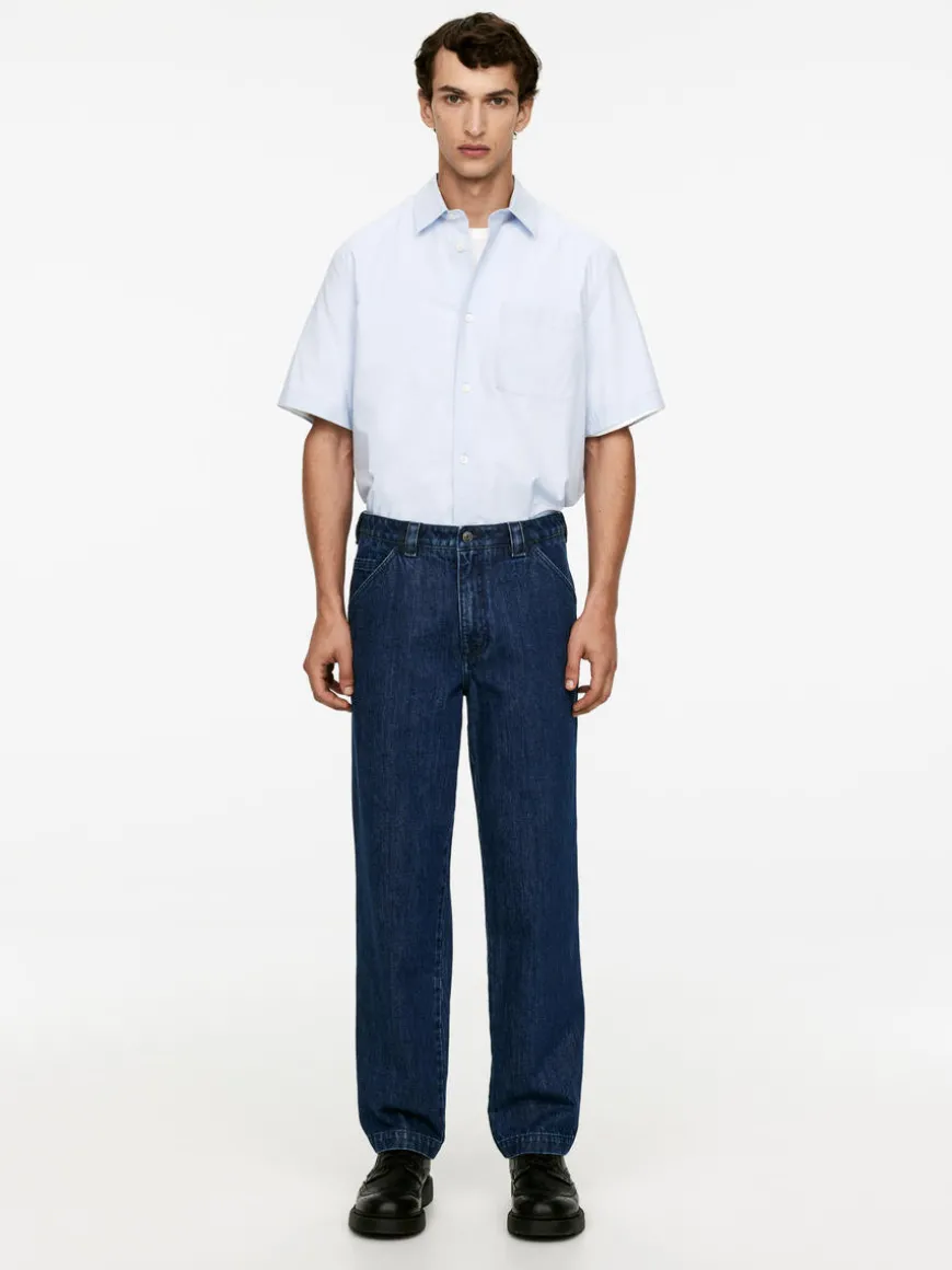 Denim workwear-inspired trousers cut for a relaxed fit. Two slanted pockets and a coin pocket at front, and two patch pockets at the back. Belt loops, button and zip fly.