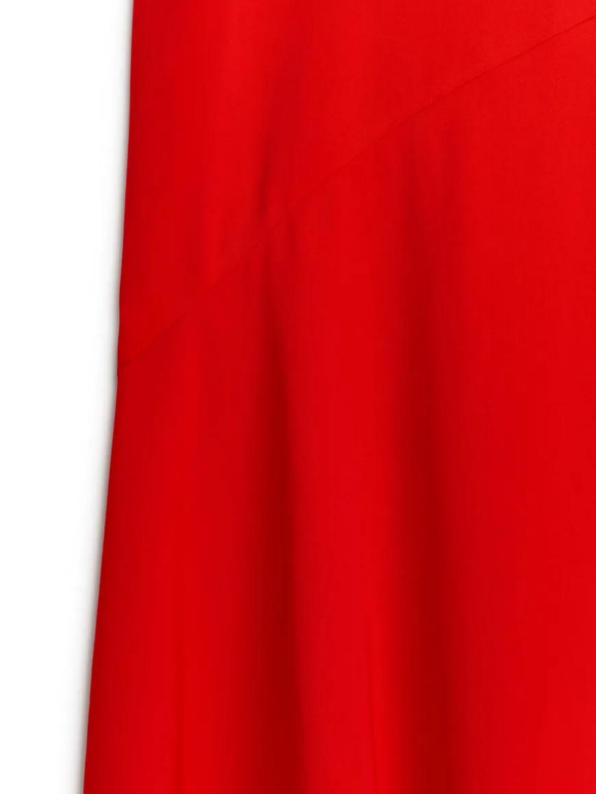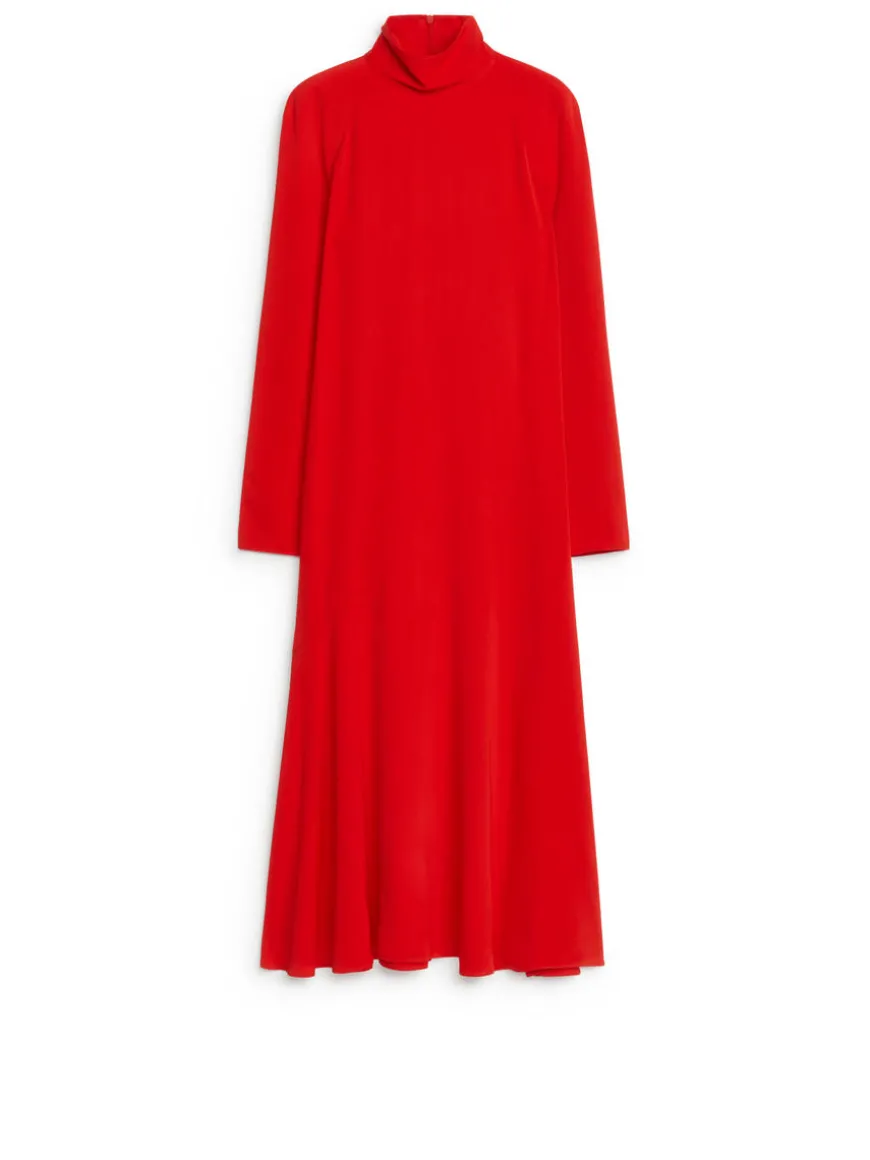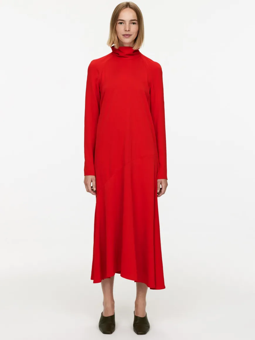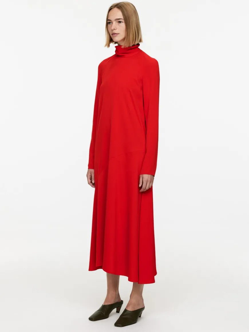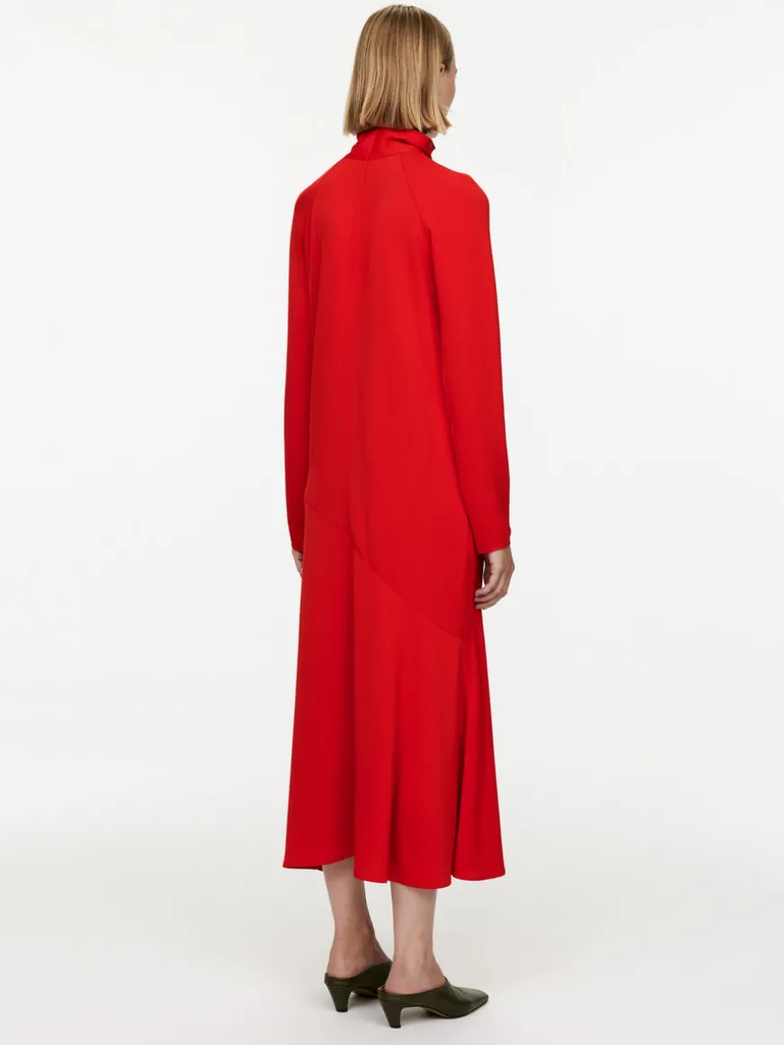 Roll-neck maxi dress with an asymmetrical bottom hem and extra long, raglan sleeves. Bias-cut skirt that adds a beautiful flare to the dress. Concealed zip at centre back.