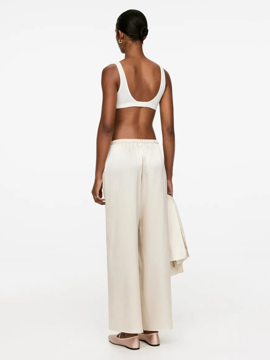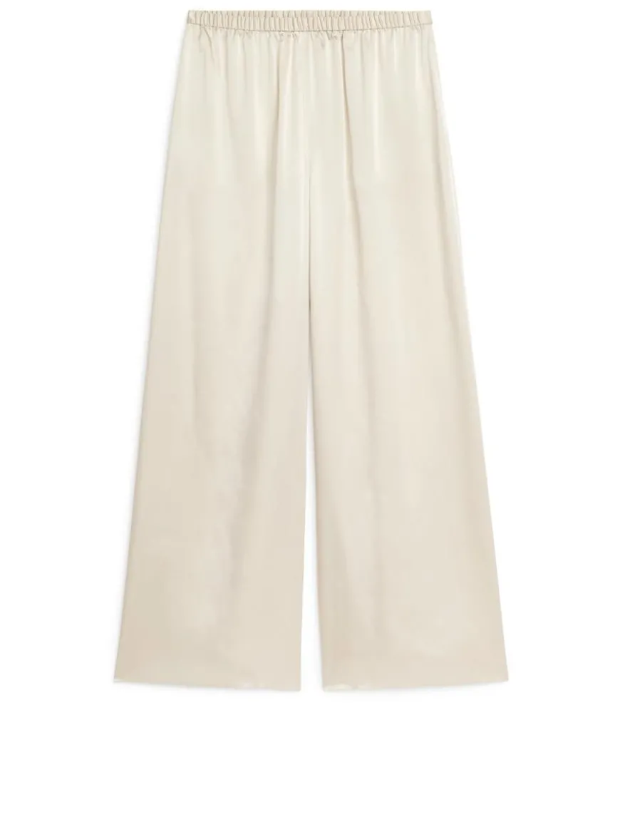 A smooth satin weave of mulberry silk gives a luxurious feel to these pyjama trousers. A high-waist style with wide legs for a relaxed, comfortable fit. Elasticated waist and pockets at side seams.