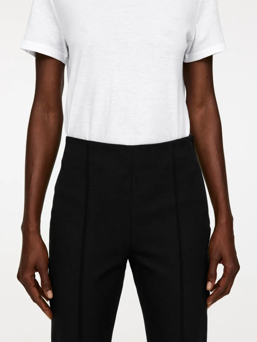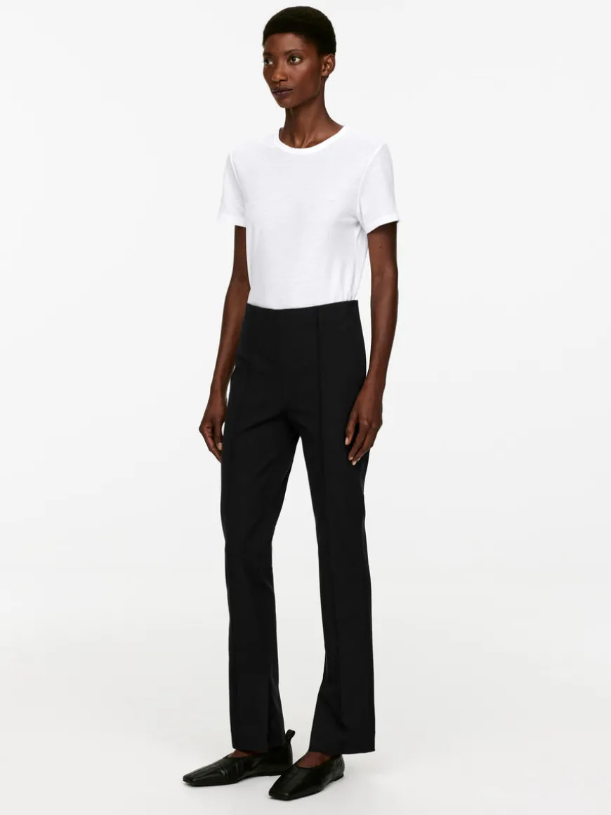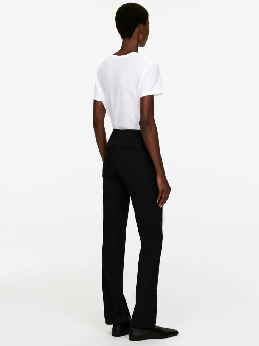 Slim trousers crafted from cotton with added stretch for comfort. Styled with stitched creases at front and vent at inside bottom hem. Single welt pockets at back hidden zip at side.