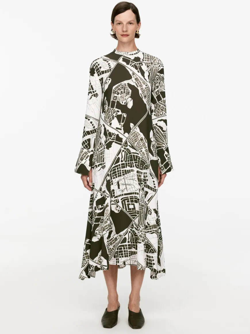 Printed dress with a voluminous skirt and a curved bottom hem. Extra long sleeves with slit at cuffs. Zip closure at centre back. The print, developed by ARKET’s team of designers and artists for the AW24 collection, pays homage to the dynamism of big city life and showcases abstracted maps of Stockholm.