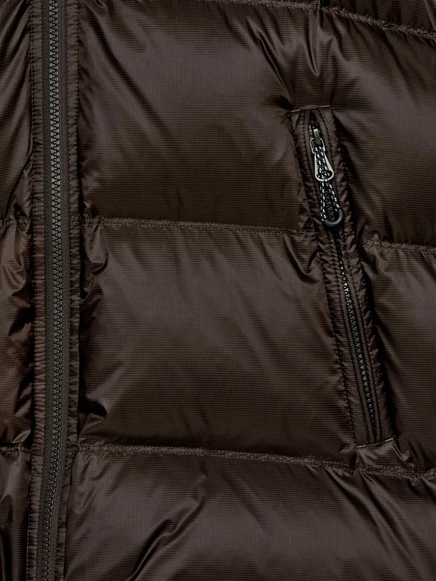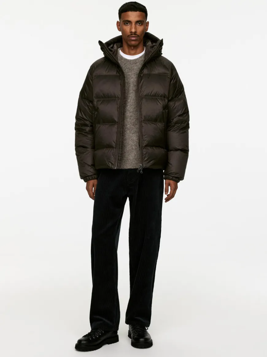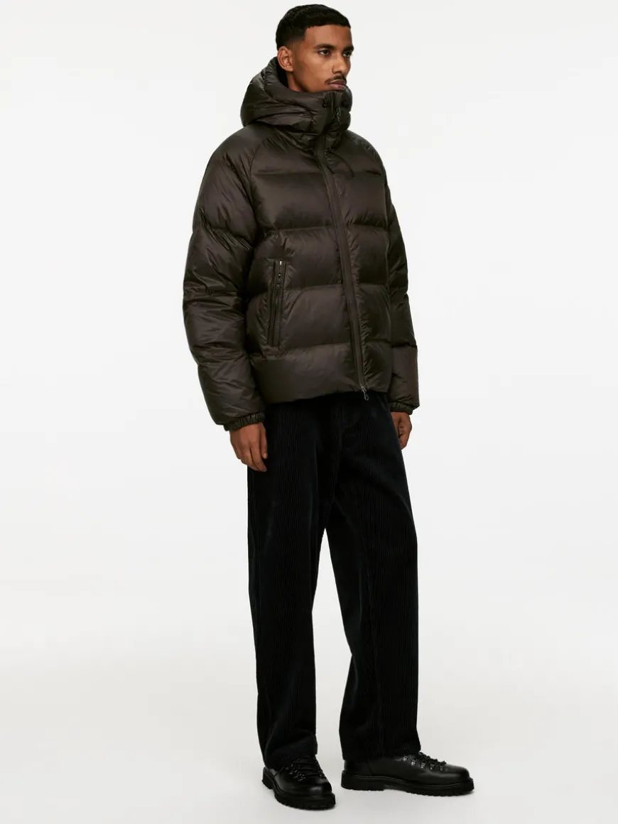 Sporty down jacket with a regular, puffy fit. Made with a polyester shell and filling made from a blend of feathers and down. Styled with a down-filled hood and double jetted pockets at front. Smart detailing include a two-way zip at front and elastics at cuffs, bottom hem (adjustable) and hood opening (adjustable). The Upcycled Down products are filled with recycled down and feathers sourced from Re:Down®. These materials, collected from used textiles, are washed and sterilised at high temperatures without the use of chemicals.