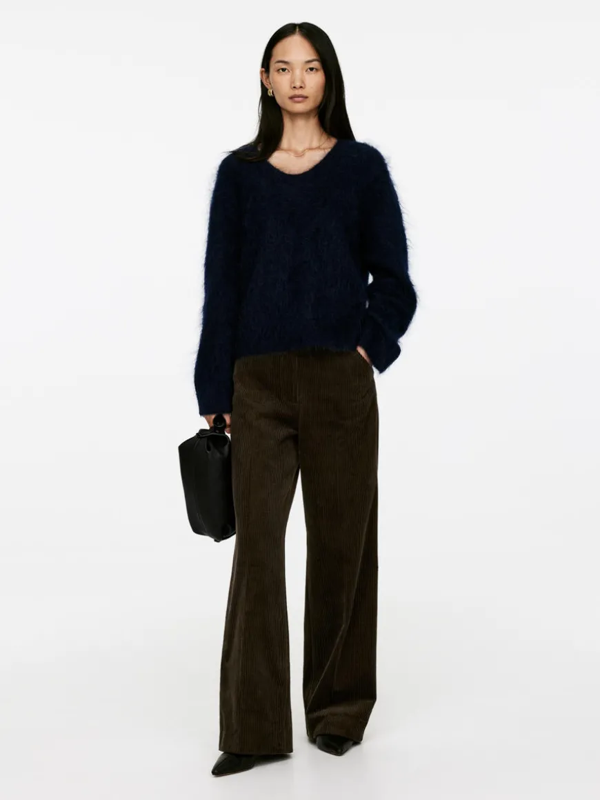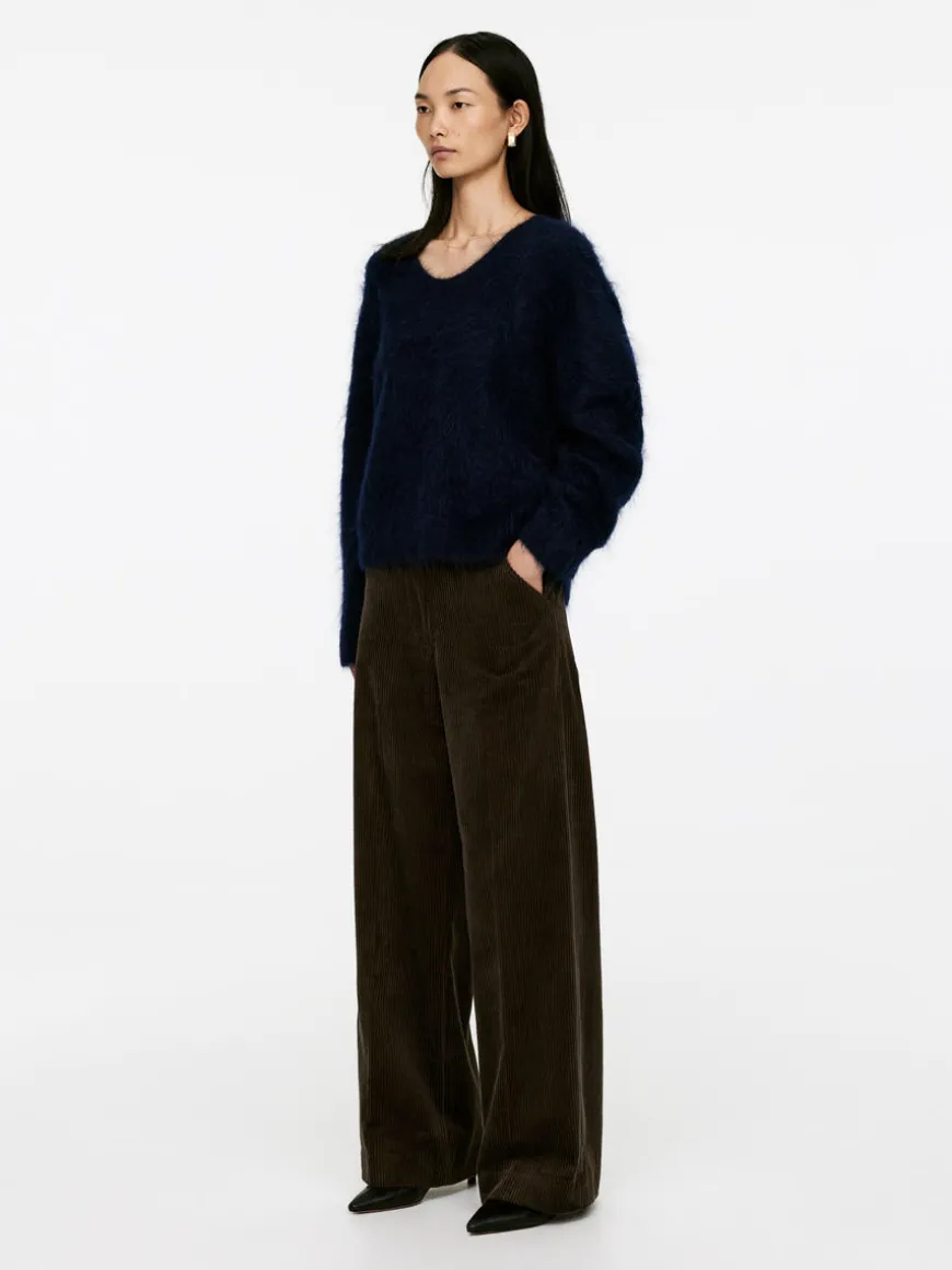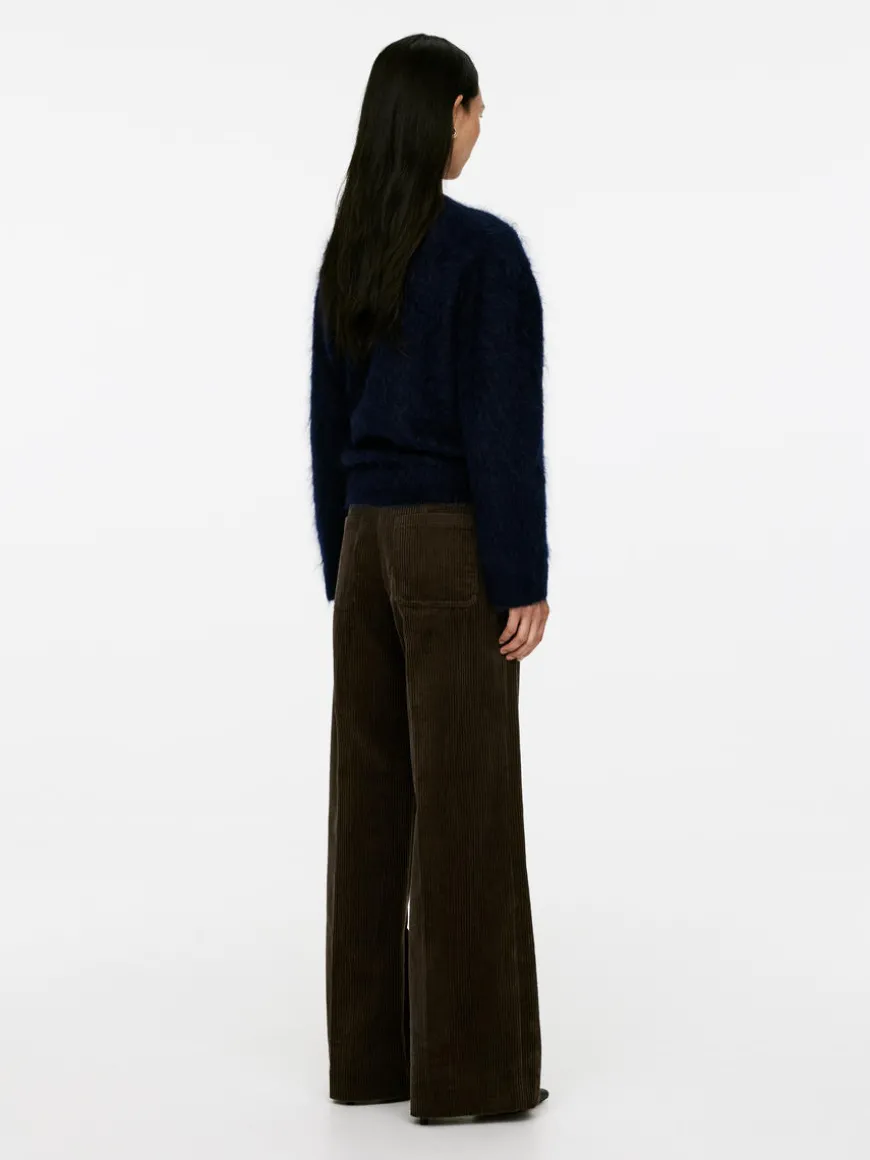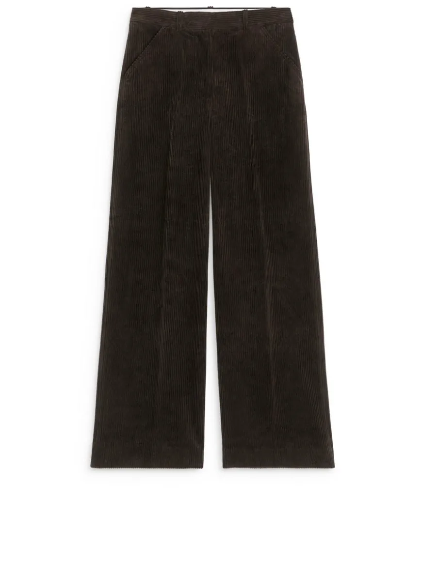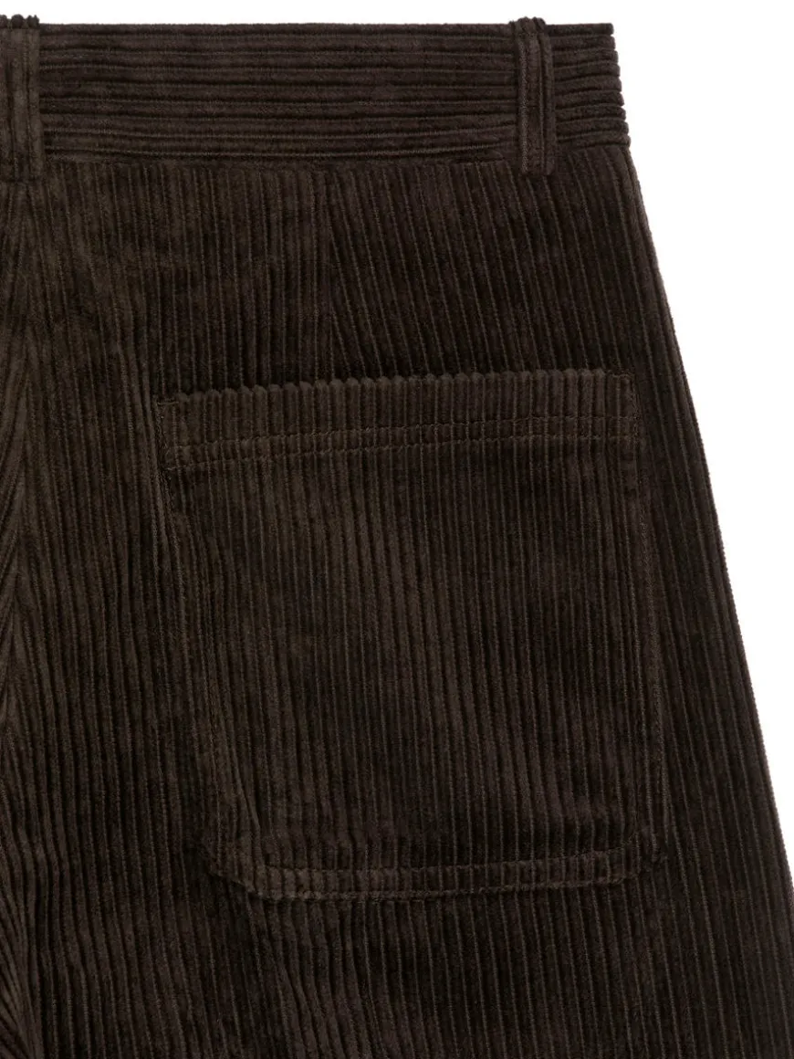 Tailored corduroy trousers with press creases at front and back. Detailed with slanted side pockets and patch pockets at back. Wide legs and hook-and-eye closure.