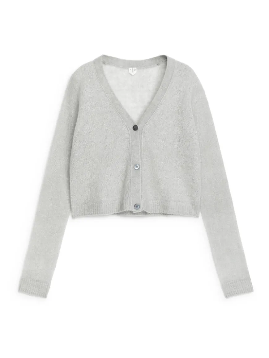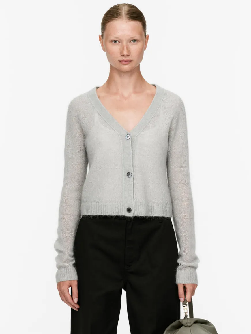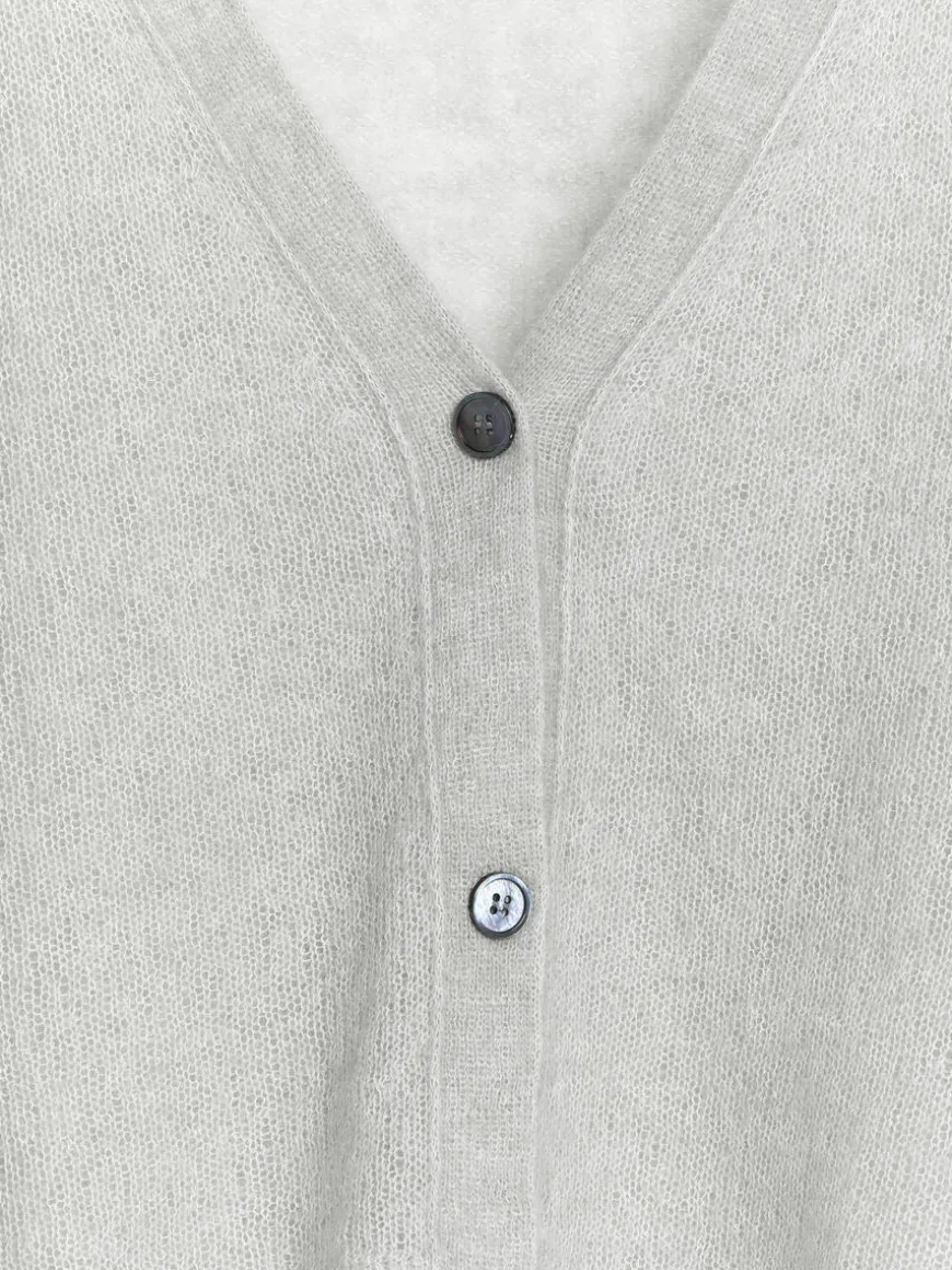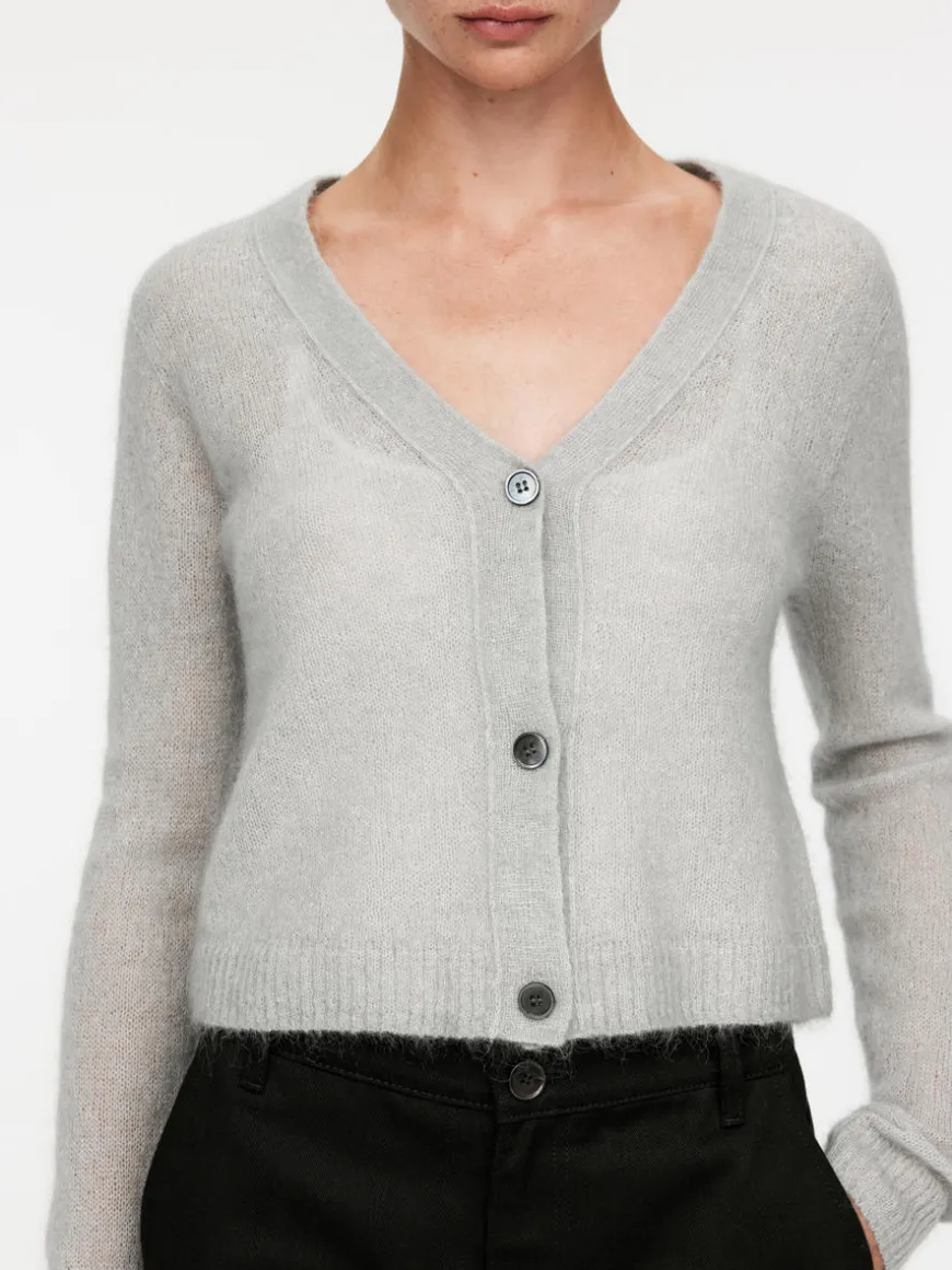 Buttoned cardigan plain-knitted in a blend of wool, mohair and nylon. Ribbed trims and a V-neck detail the look. The cardigan contains 35% RMS Mohair and 35% RWS wool (TE-00047206). Products certified to the Responsible Wool Standard (RWS) contain wool fiber from farms independently certified to animal welfare and land management requirements.