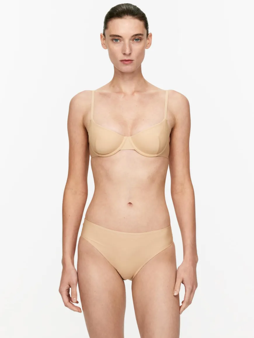 Wired balconette bra with clean bonded edges. Designed with slender adjustable shoulder straps and bust darts. Double layer fabric in cup for extra support.