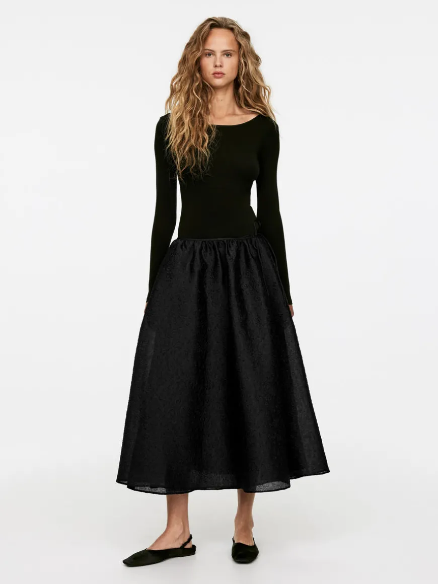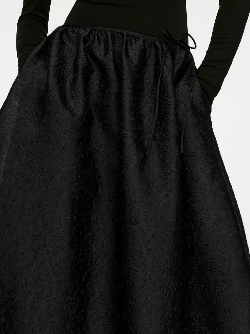 Semi-sheer skirt with a floral jacquard finish. A mid-length style with wrap front with delicate tie-band at waist. Lining at back.
