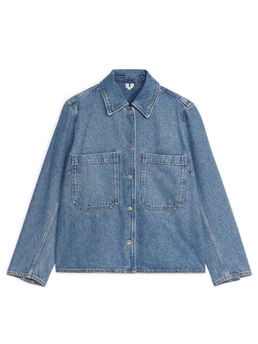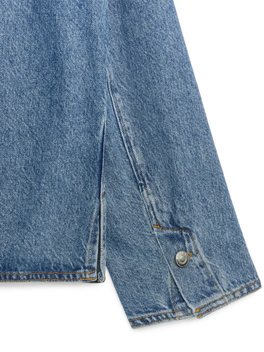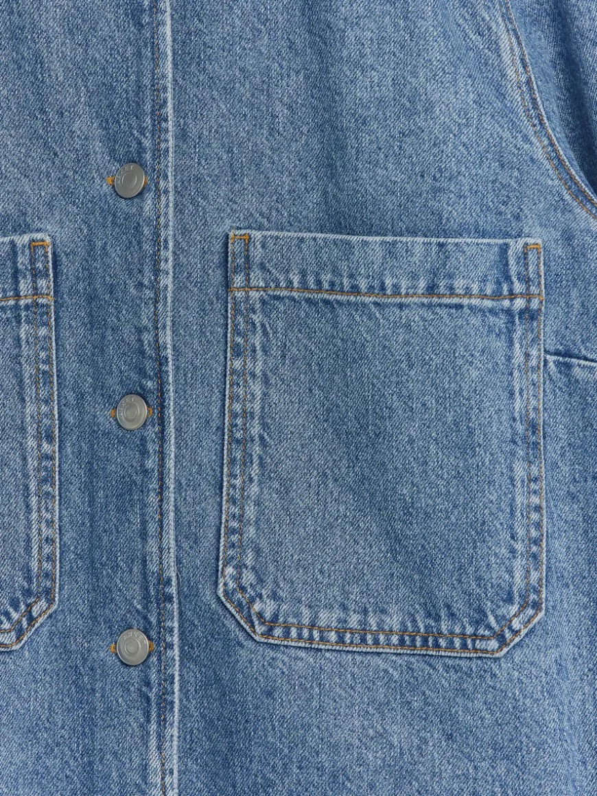 Straight-cut denim shirt made from a blend of recycled and organic cotton. Styled with a regular collar, a button-up front and two patch pockets. Buttoned slits at end of sleeves.