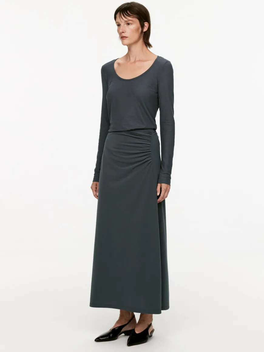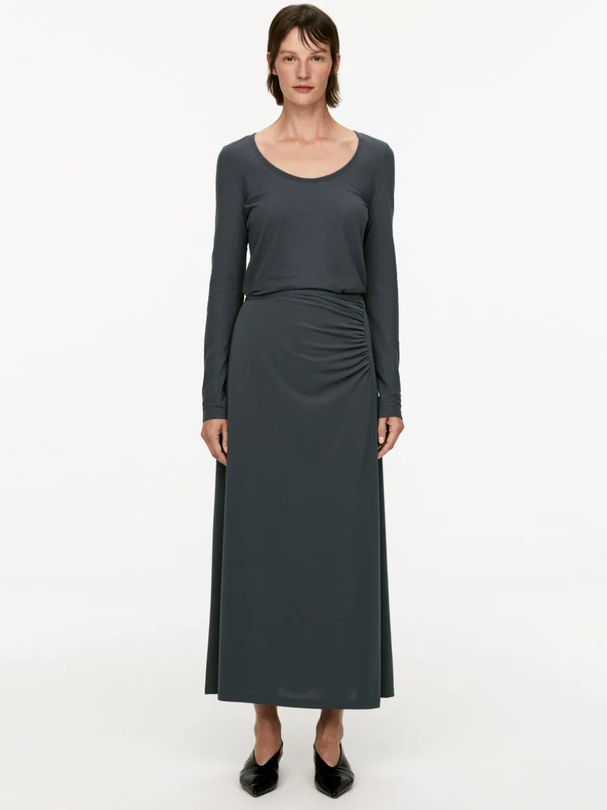 Maxi skirt crafted from an interlock jersey fabric. Elastics at waist and gathers at side.
