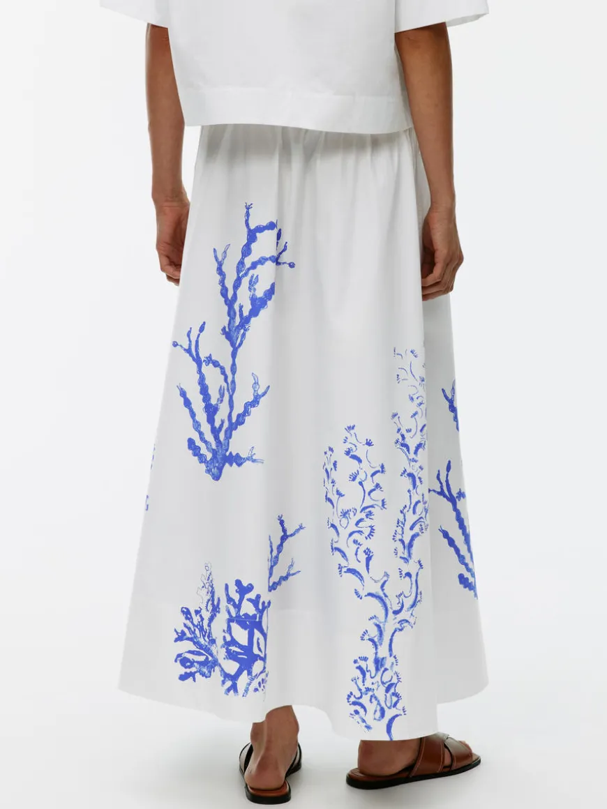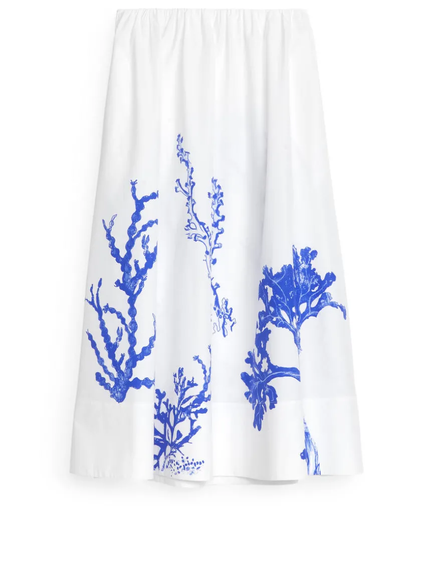 A-line midi skirt in cotton. Hidden elastics at waist and hidden side pockets. Slits at sides. Unlined.