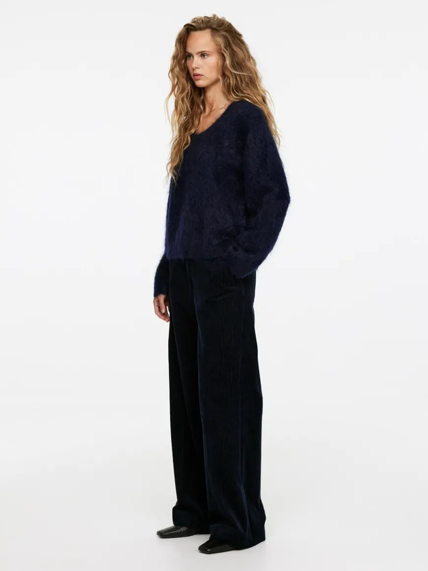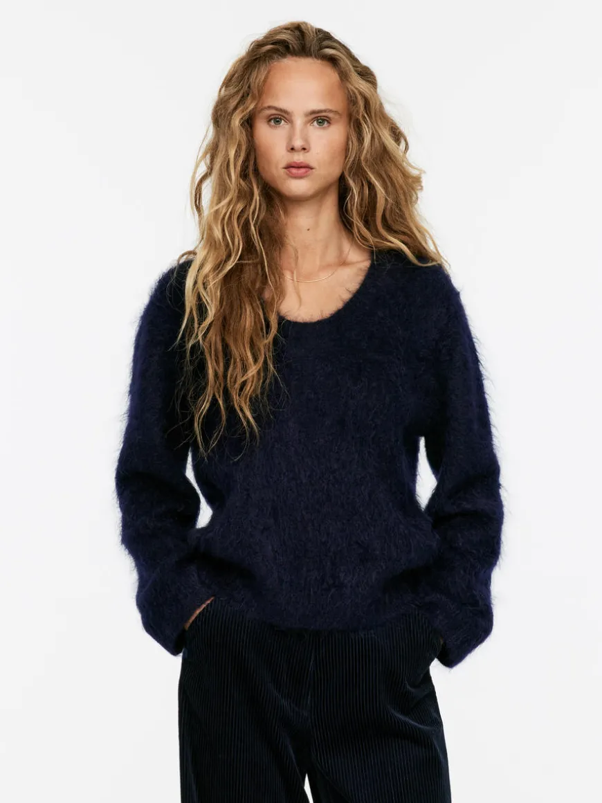 Jumper knitted from a wool and mohair blend. Styled with a U-neck and a relaxed fit. This jumper contains 45% RMS Mohair and 17% RWS wool (TE-00047206). Products certified to the Responsible Wool Standard (RWS) and the Responsible Mohair Standard (RMS) contain wool and mohair fiber from farms independently certified to animal welfare and land management requirements.