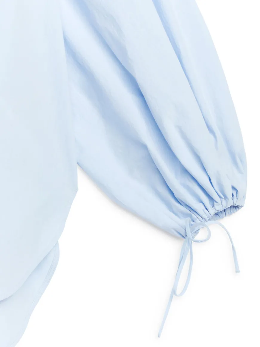 Blouse crafted from cotton with puffy sleeves ending in drawstring cuffs. A loose-fitted style with gatherings at the back and front buttoning.