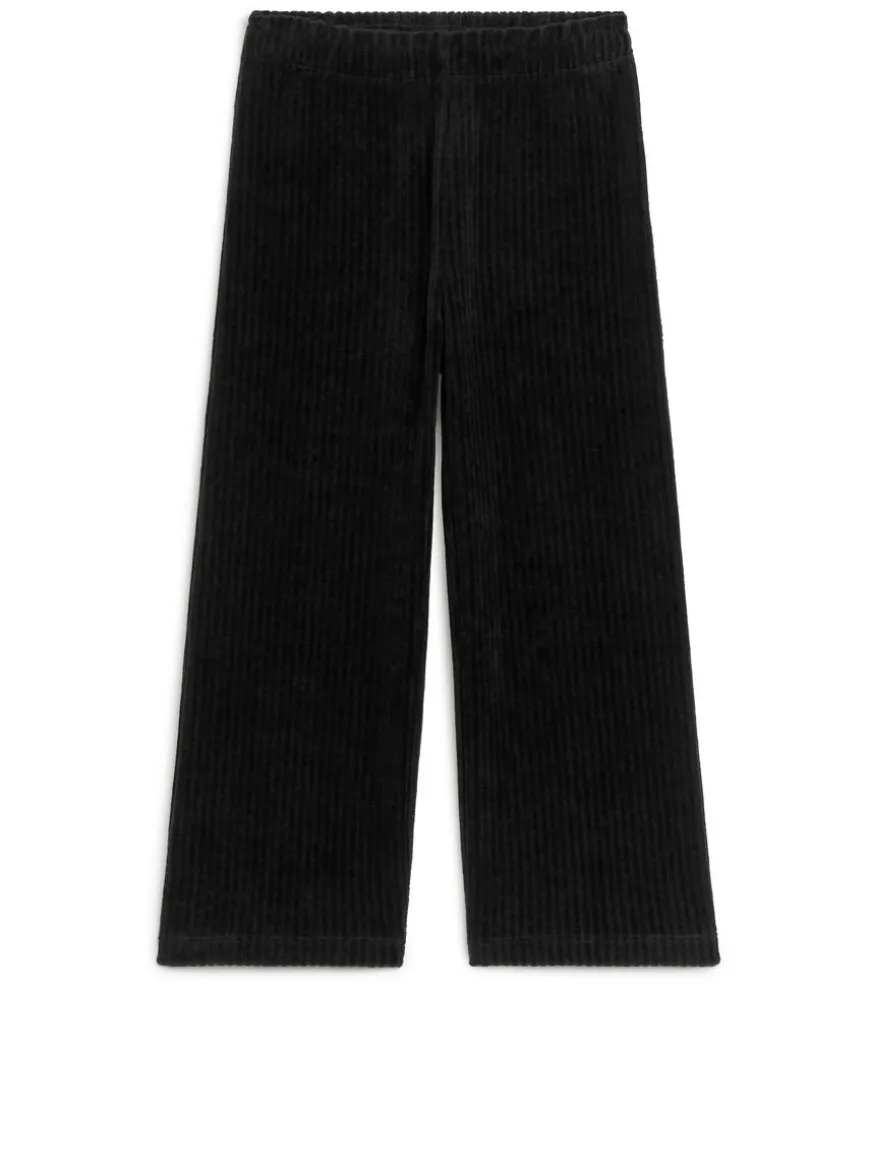 Velvet trousers with a rib-knitted structure made from a stretchy cotton blend cotton. Detailed with adjustable elastics at waist.