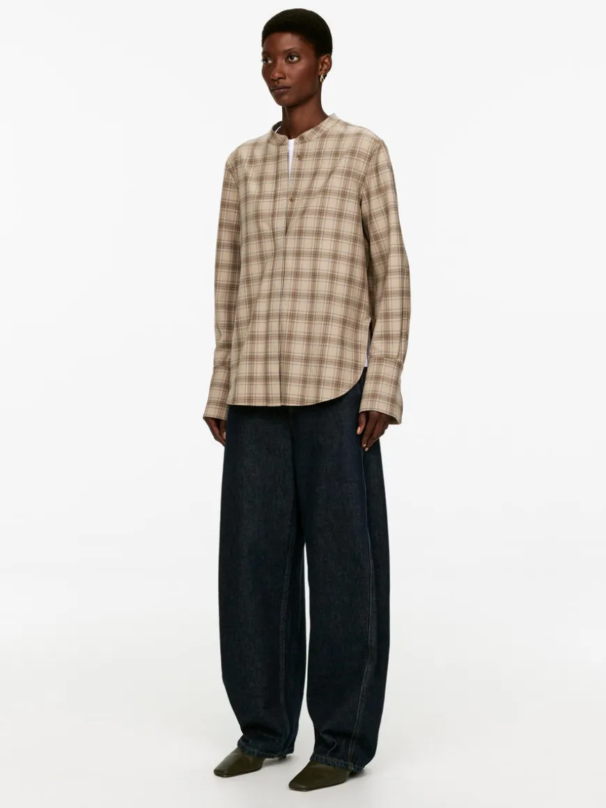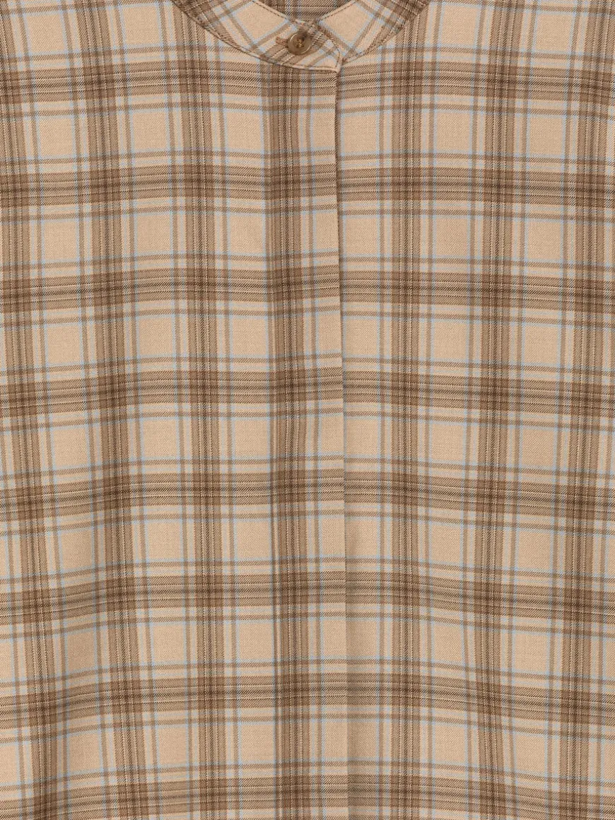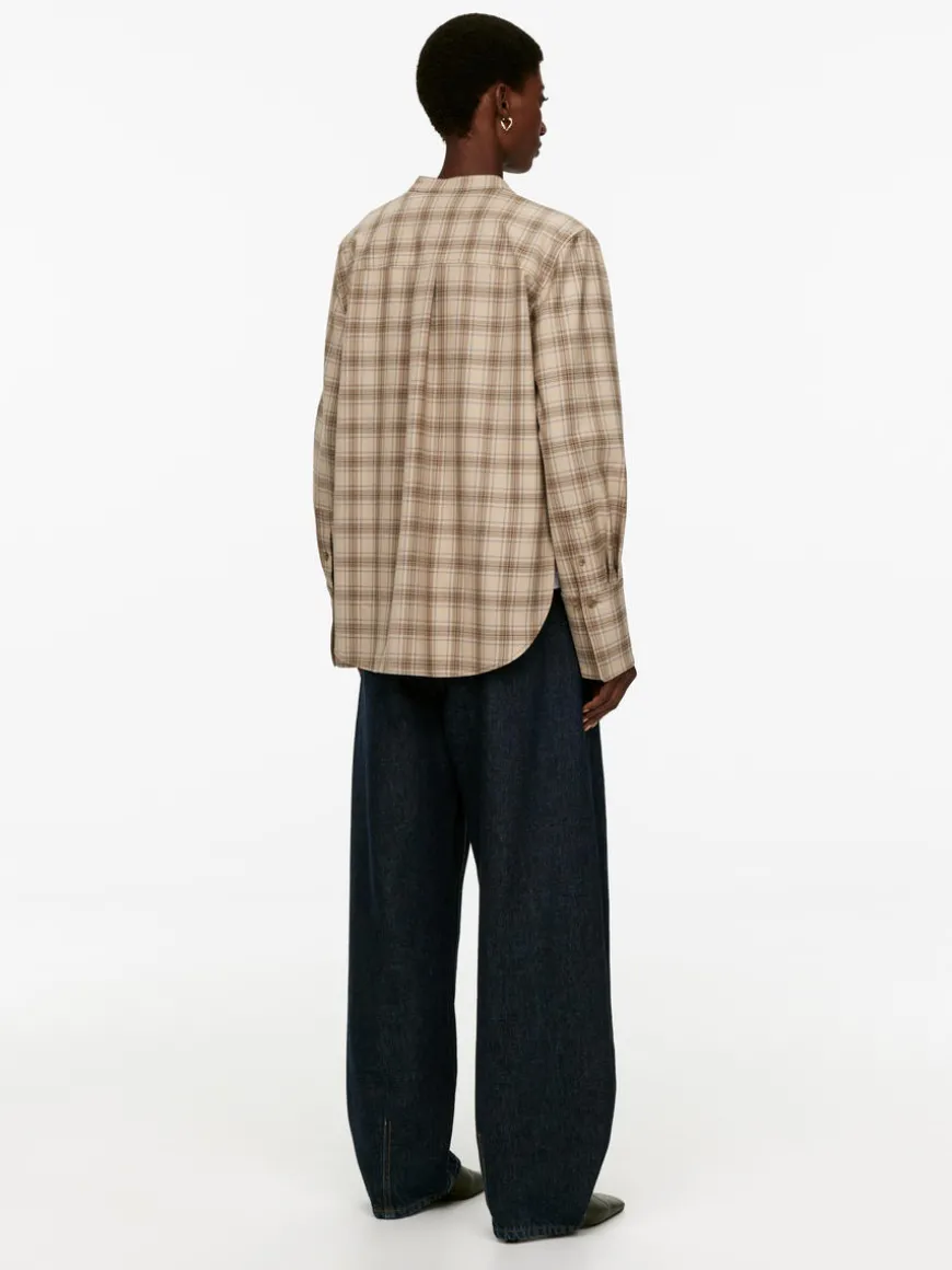 Shirt styled with a standing collar and a hidden placket with button closure. Wide cuffs and a rounded bottom hem. Regular fit. The shirt contains 38% RWS wool (TE-00047206). Products certified to the Responsible Wool Standard (RWS) contain wool fiber from farms independently certified to animal welfare and land management requirements.