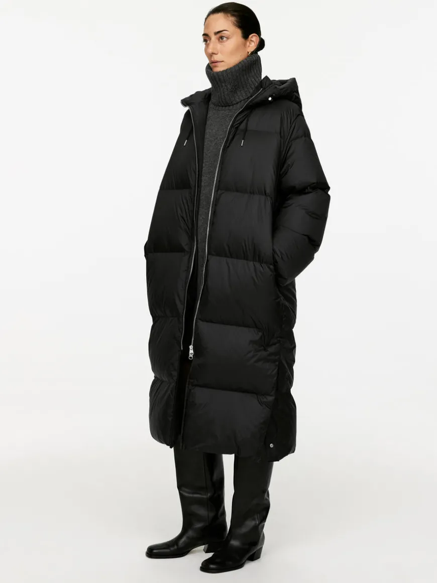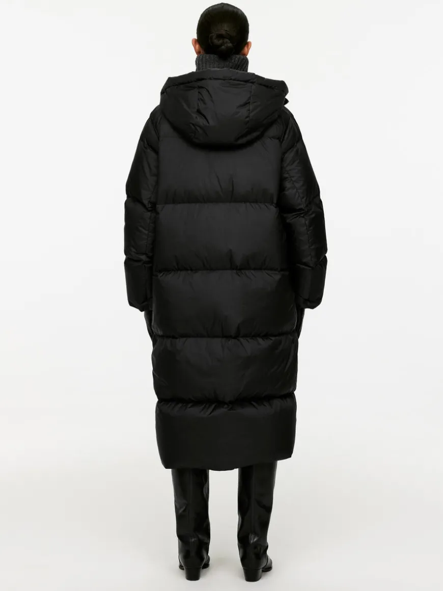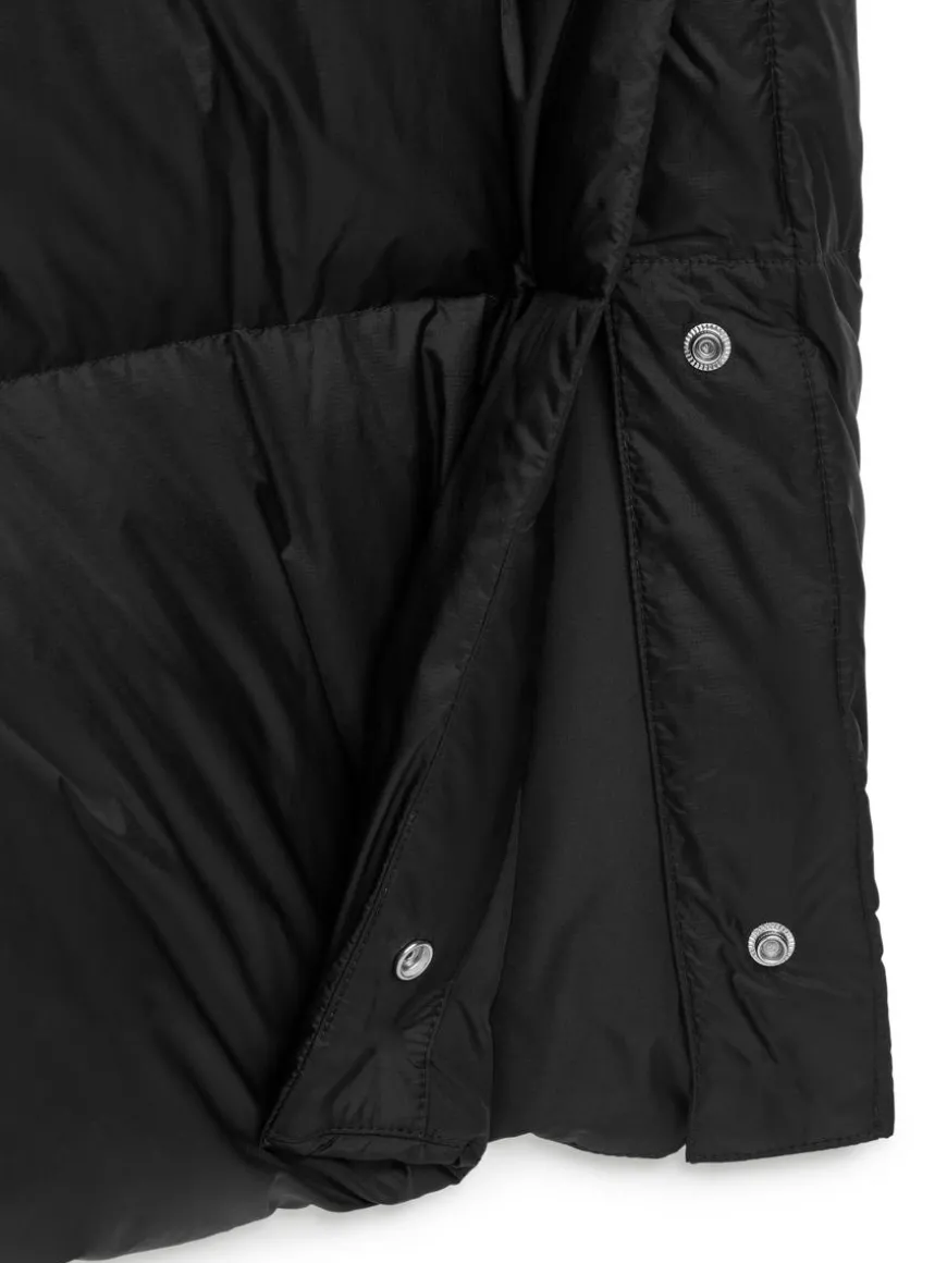 Long coat filled with a blend of down and feathers. A hooded style with zip closure at front and hidden side slits with snap buttons. Side pockets with zip closure. The Upcycled Down products are filled with recycled down and feathers sourced from Re:Down®. These materials, collected from used textiles, are washed and sterilised at high temperatures without the use of chemicals.