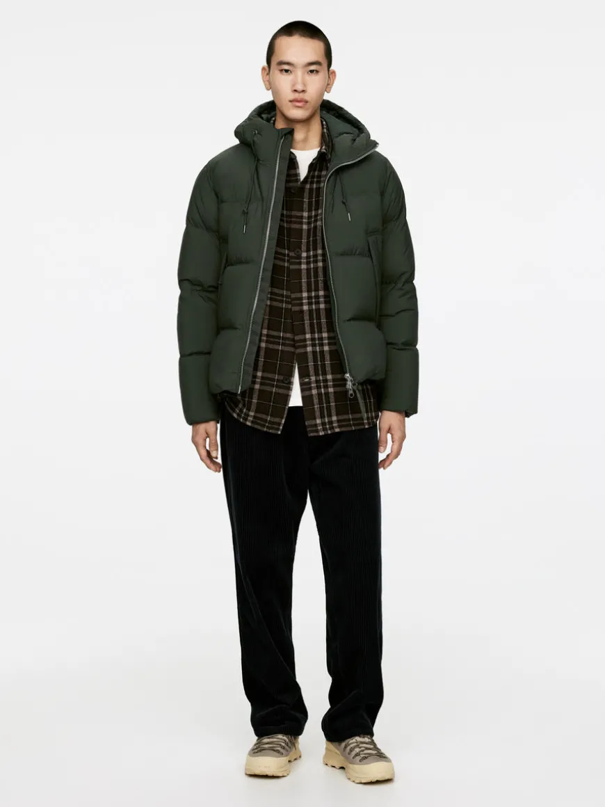 Mid-length quilted jacket filled with a blend of down and feathers. This style offers excellent insulating comfort in dry and cold weather. Featuring a hood with drawstring and zip closure at front with a zip guard underneath. The elastic bindings at the cuffs and bottom hem help to protect from cold wind. Welt pockets with hidden snap buttons. Two inside pockets, one with zip and one with snap button. The Upcycled Down products are filled with recycled down and feathers sourced from Re:Down®. These materials, collected from used textiles, are washed and sterilised at high temperatures without the use of chemicals.