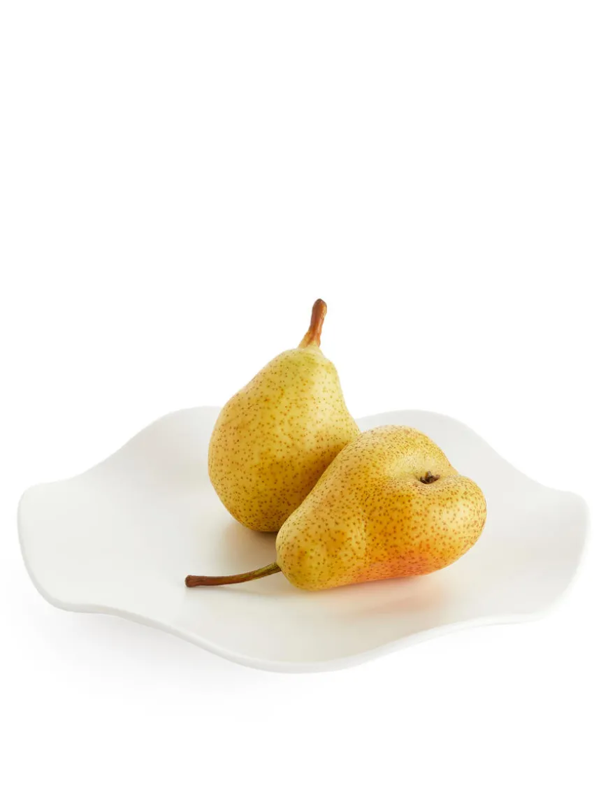 Plate for serving and dining. The plate features an elegant wavy shape and is made from glazed stoneware. Diameter 27 cm, height 3.2 cm.