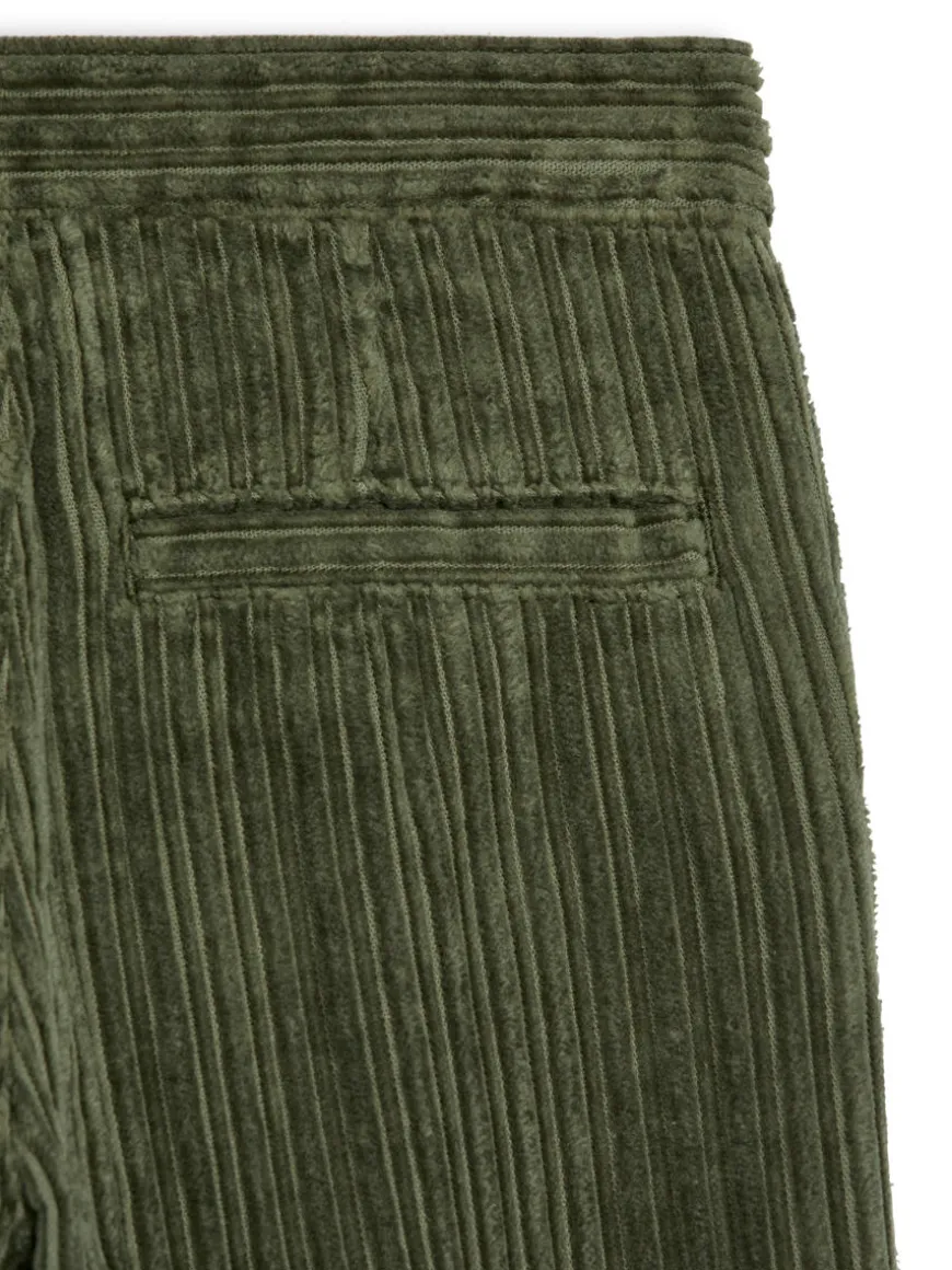 Wide-fitted corduroy trousers with pleats at front. Adjustable elastics at waist and zip and press button. Slanted side pockets and single welt pocket at back.